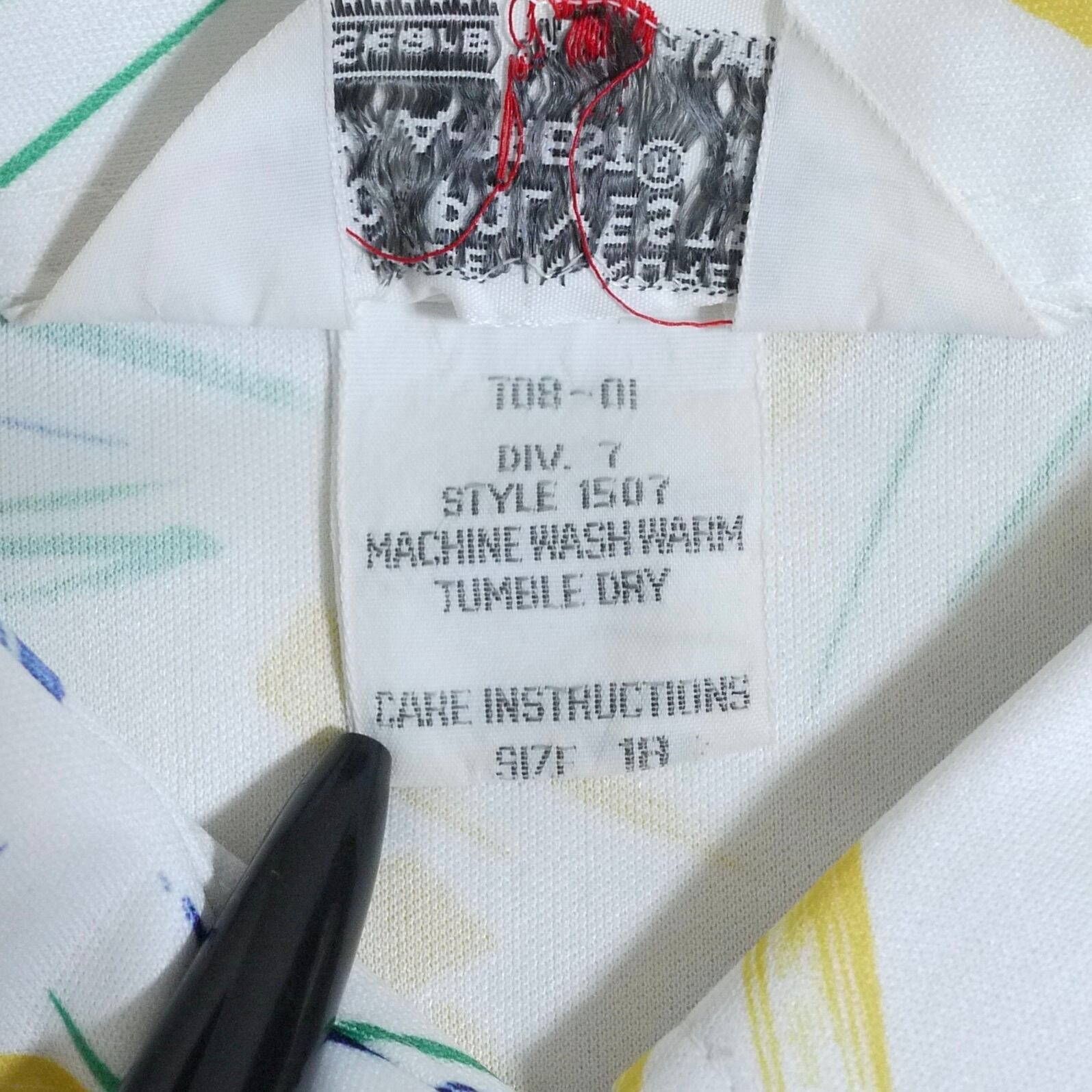 ホワイトカラーをベースにしたカラフルな総柄の半袖シャツ。