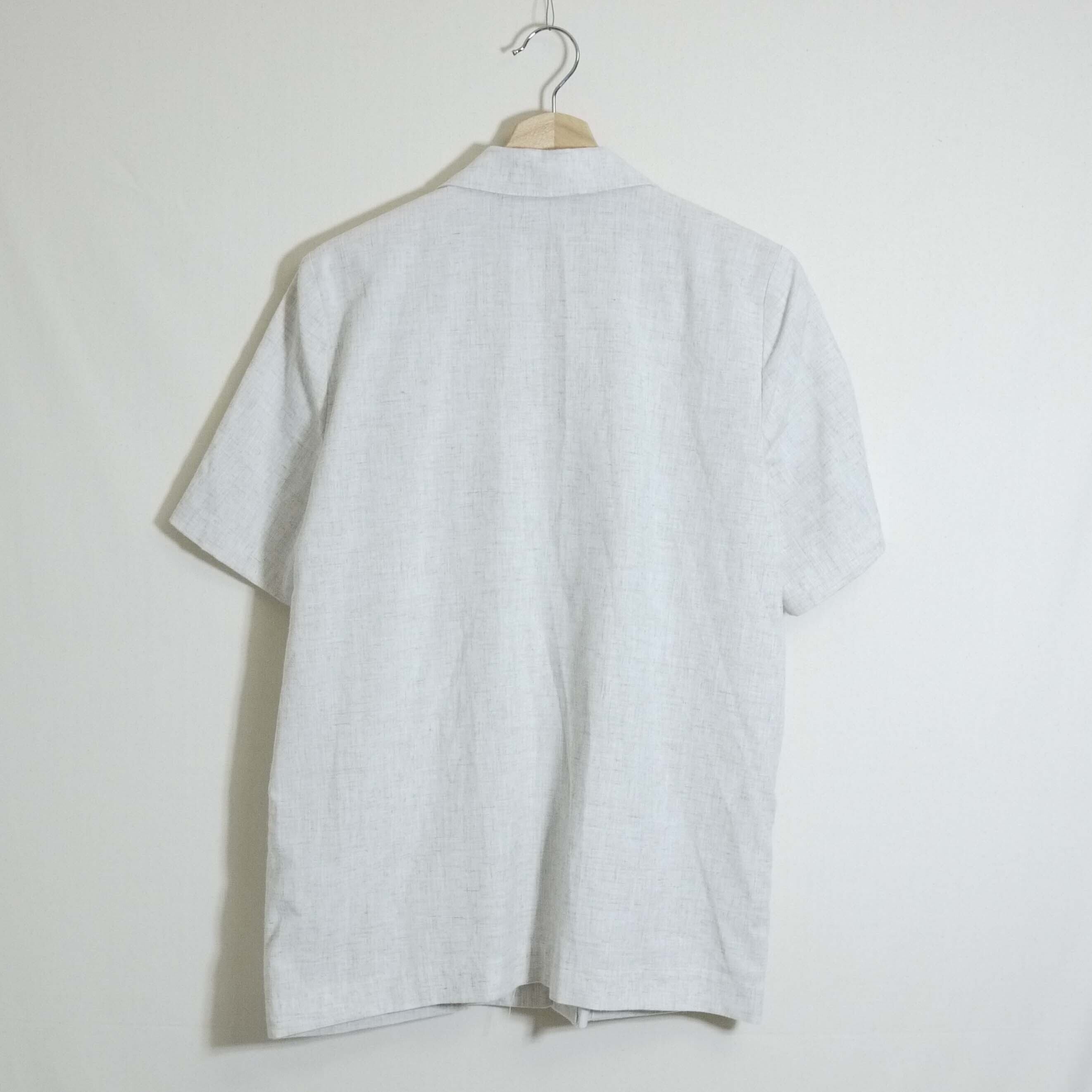 落ち着いた生成りで絣地のような表情のある生地のセットアップ。