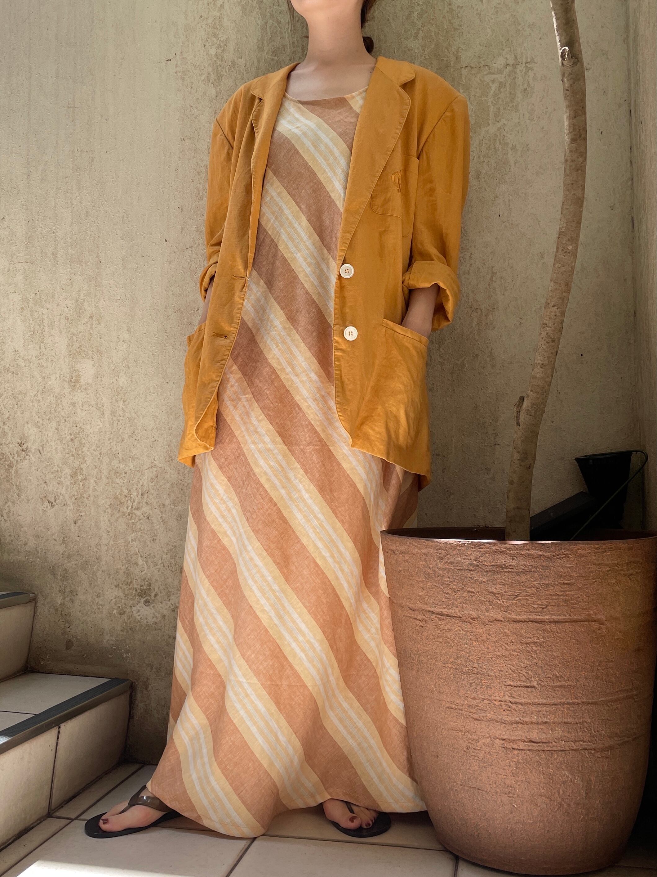 ベージュ×ブラウンのマルチストライプ柄のワンピース。