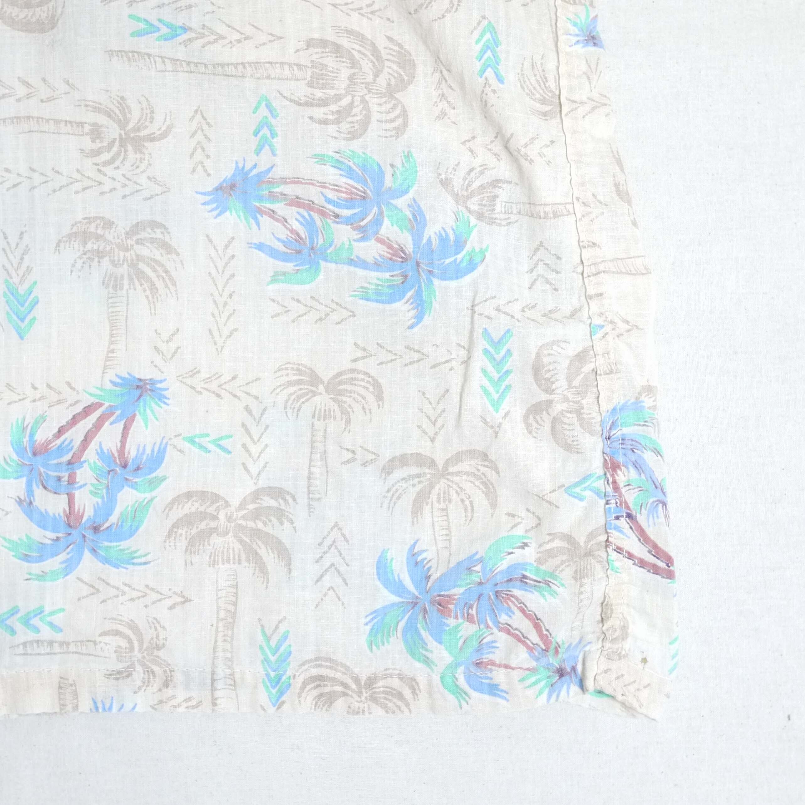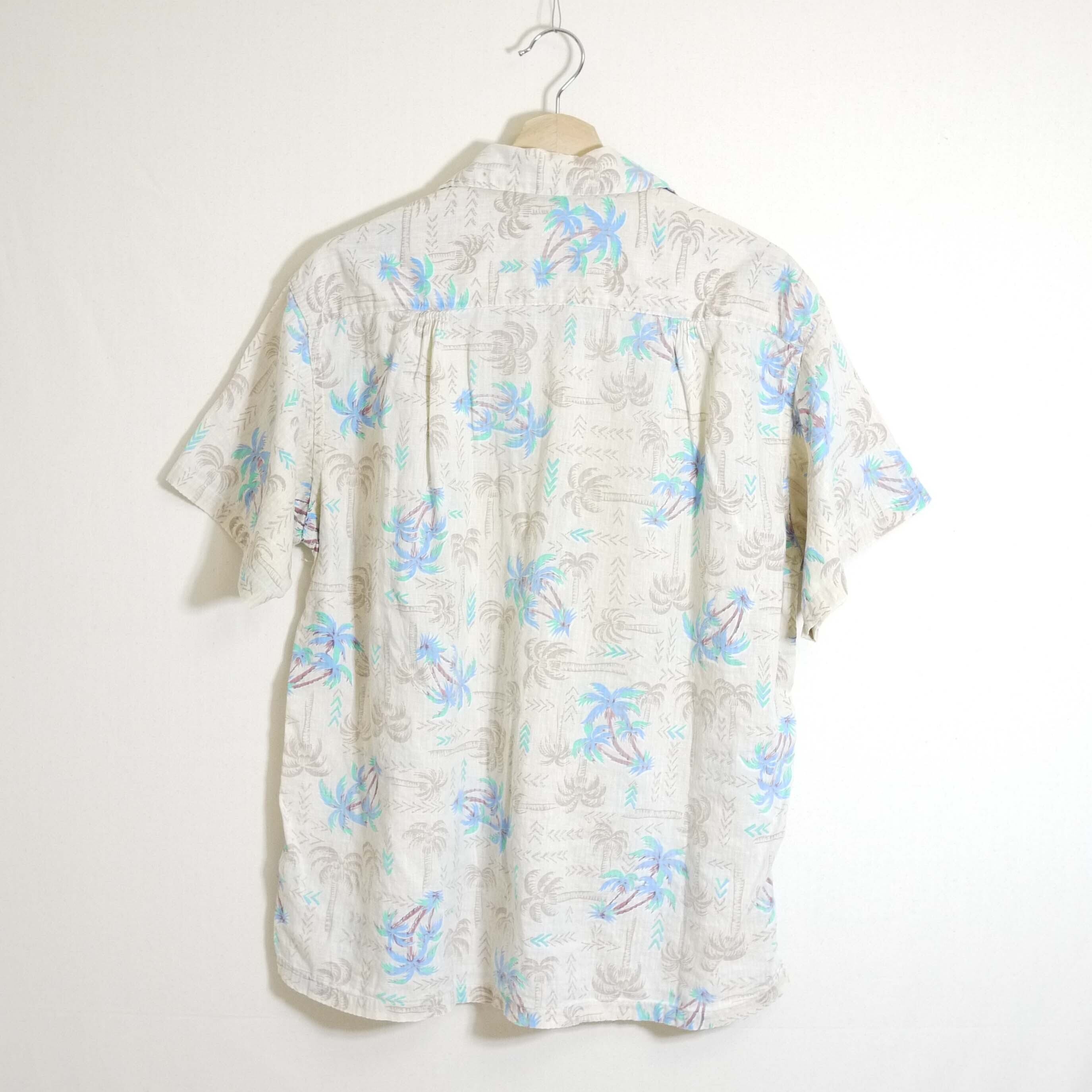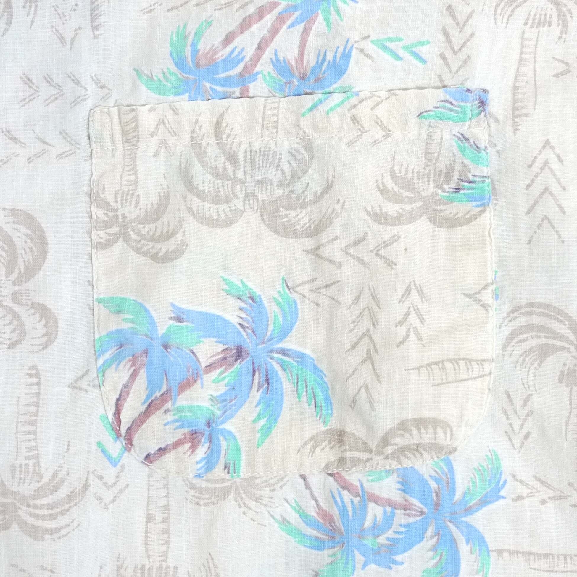 ベージュカラーのボディーに好配色のヤシの木柄の半袖シャツ。