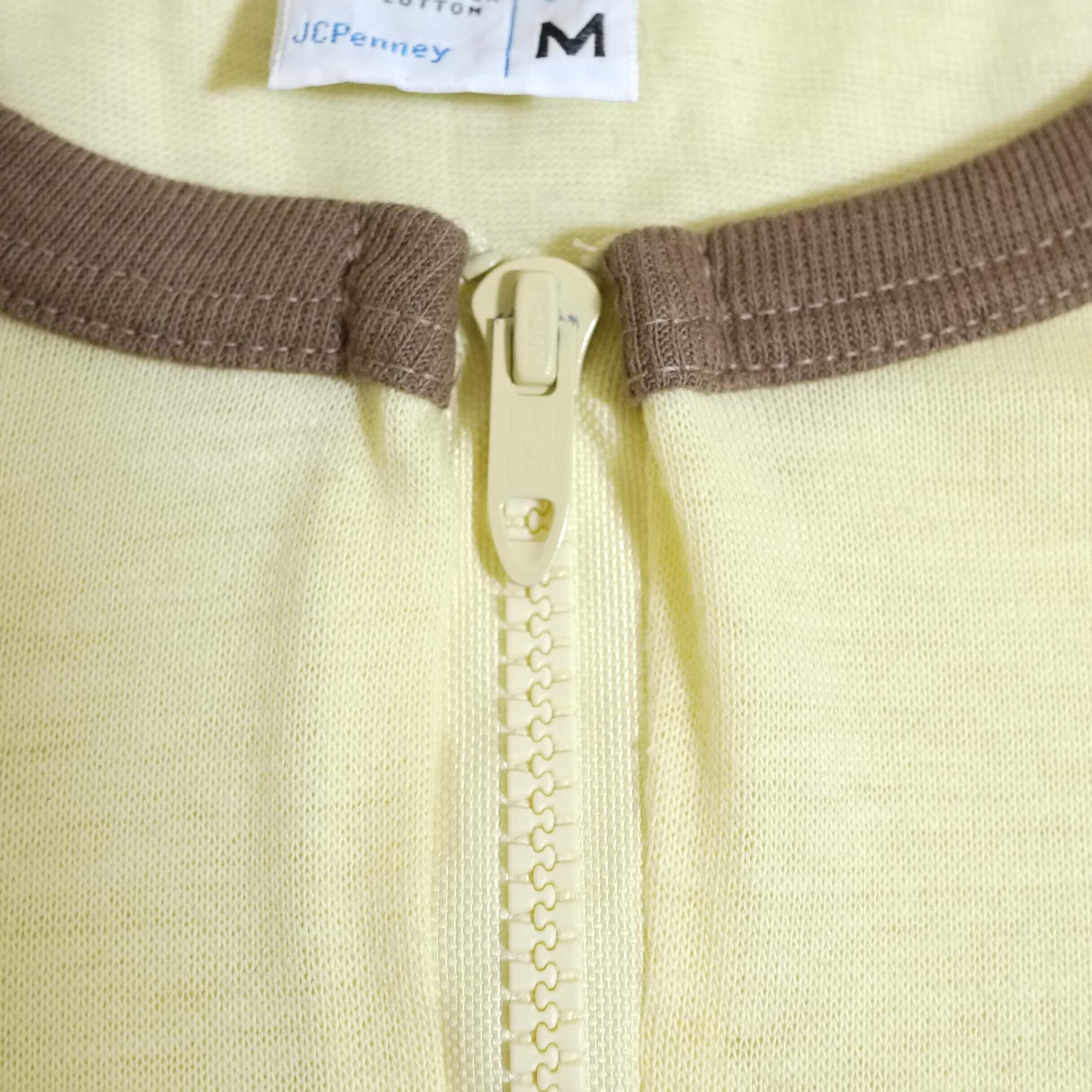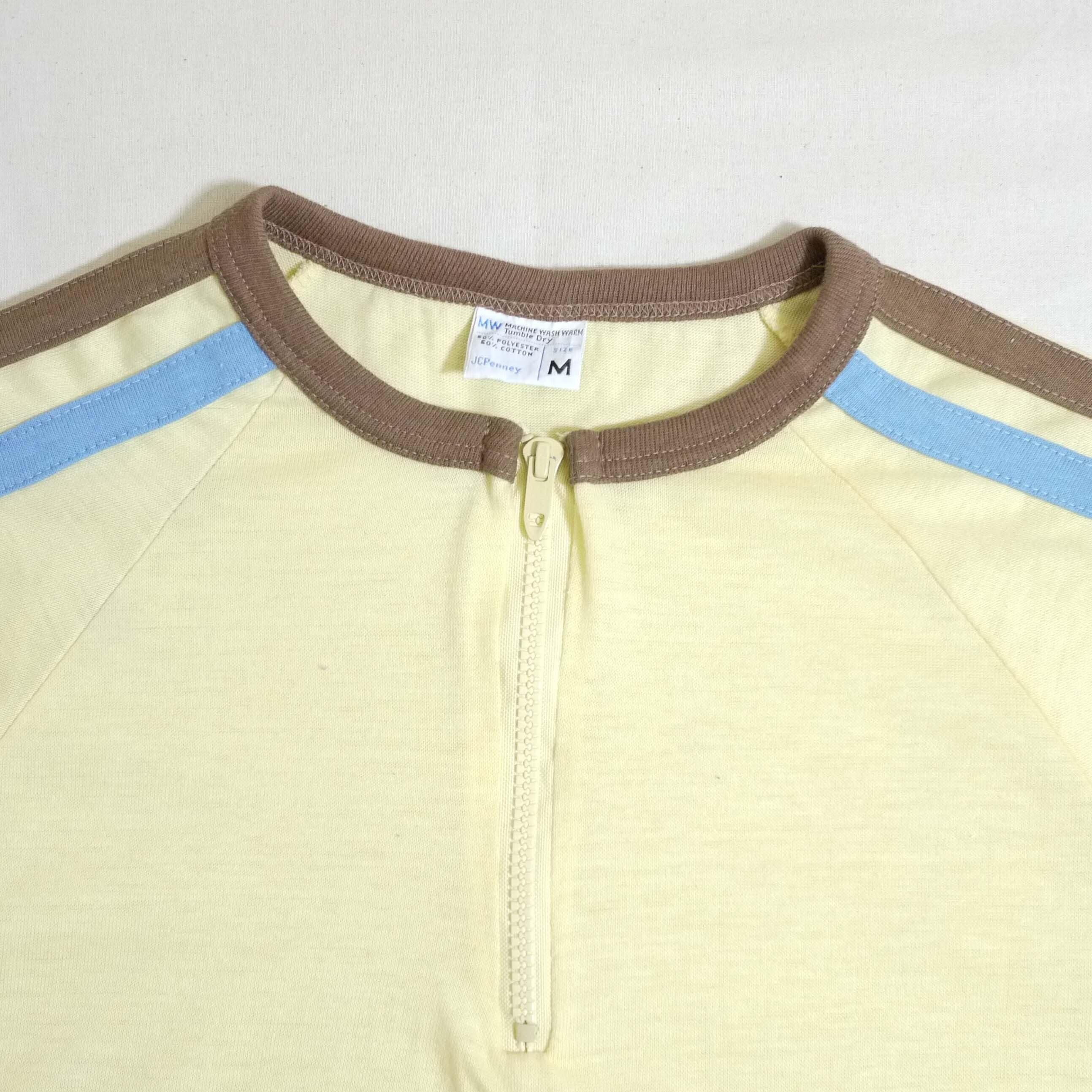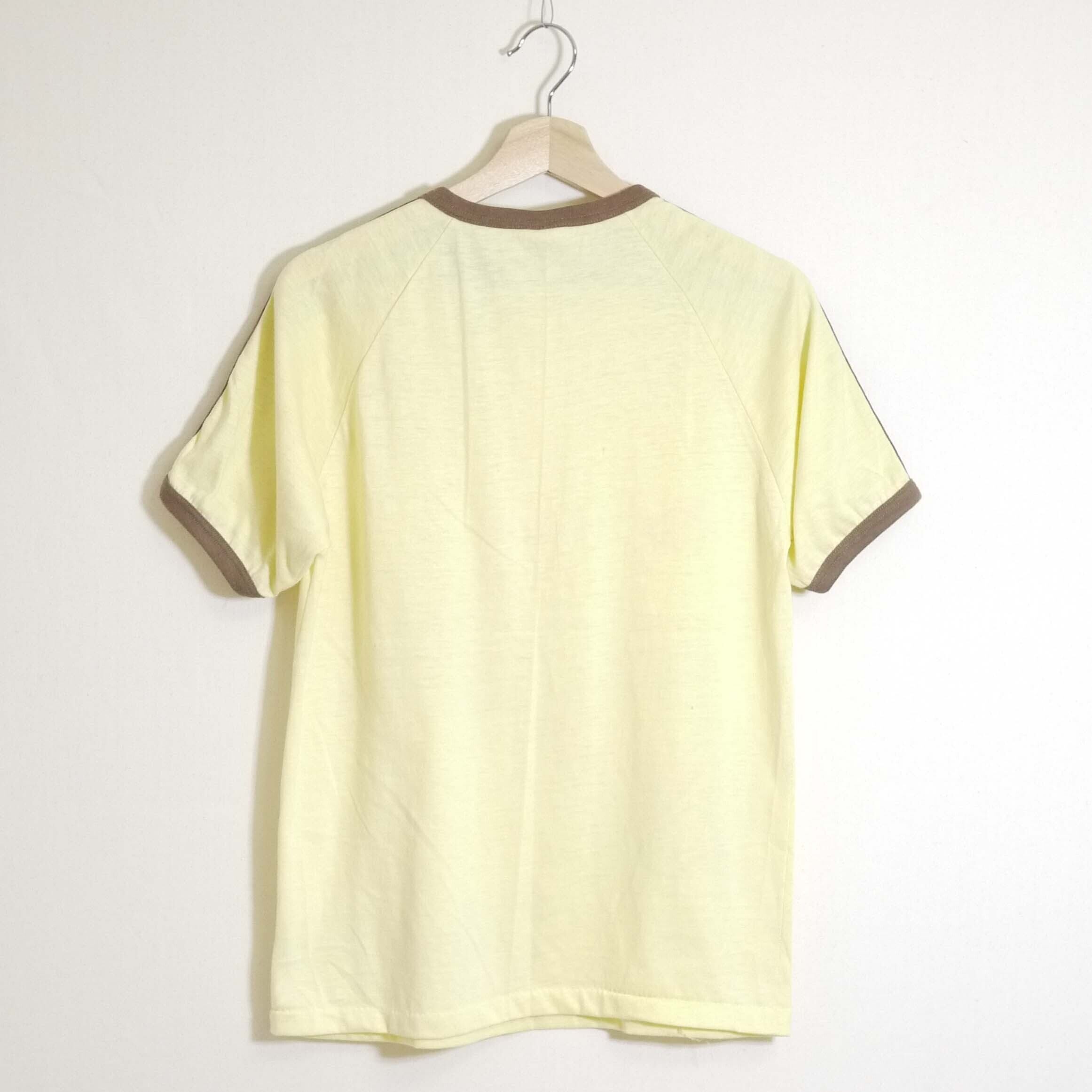 ライトイエローカラーのボディに好配色のラインデザインのTシャツ。