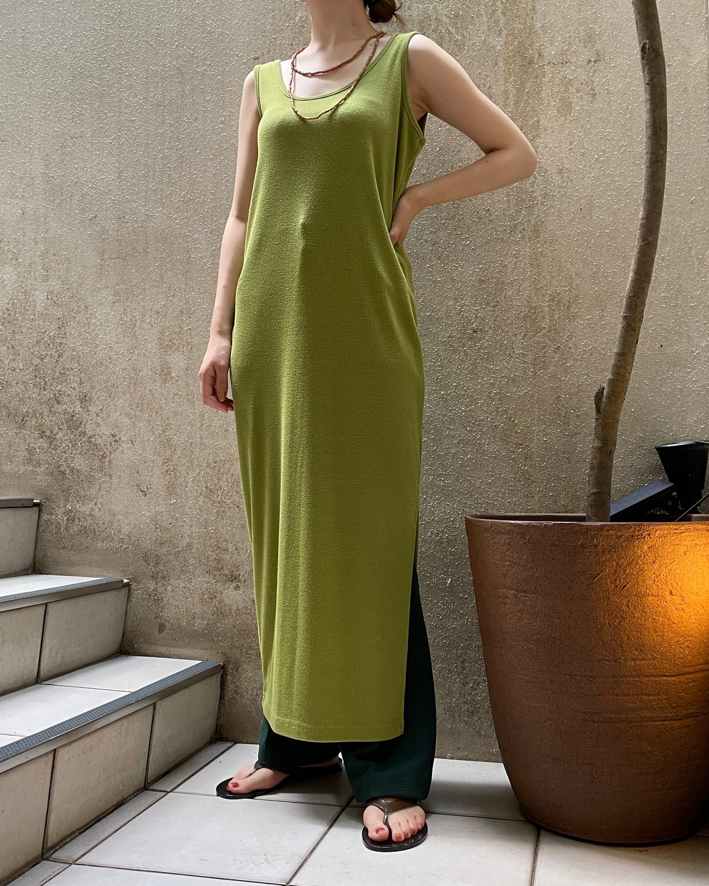 落ち着いたグリーンカラーのキレイなフレアシルエット。