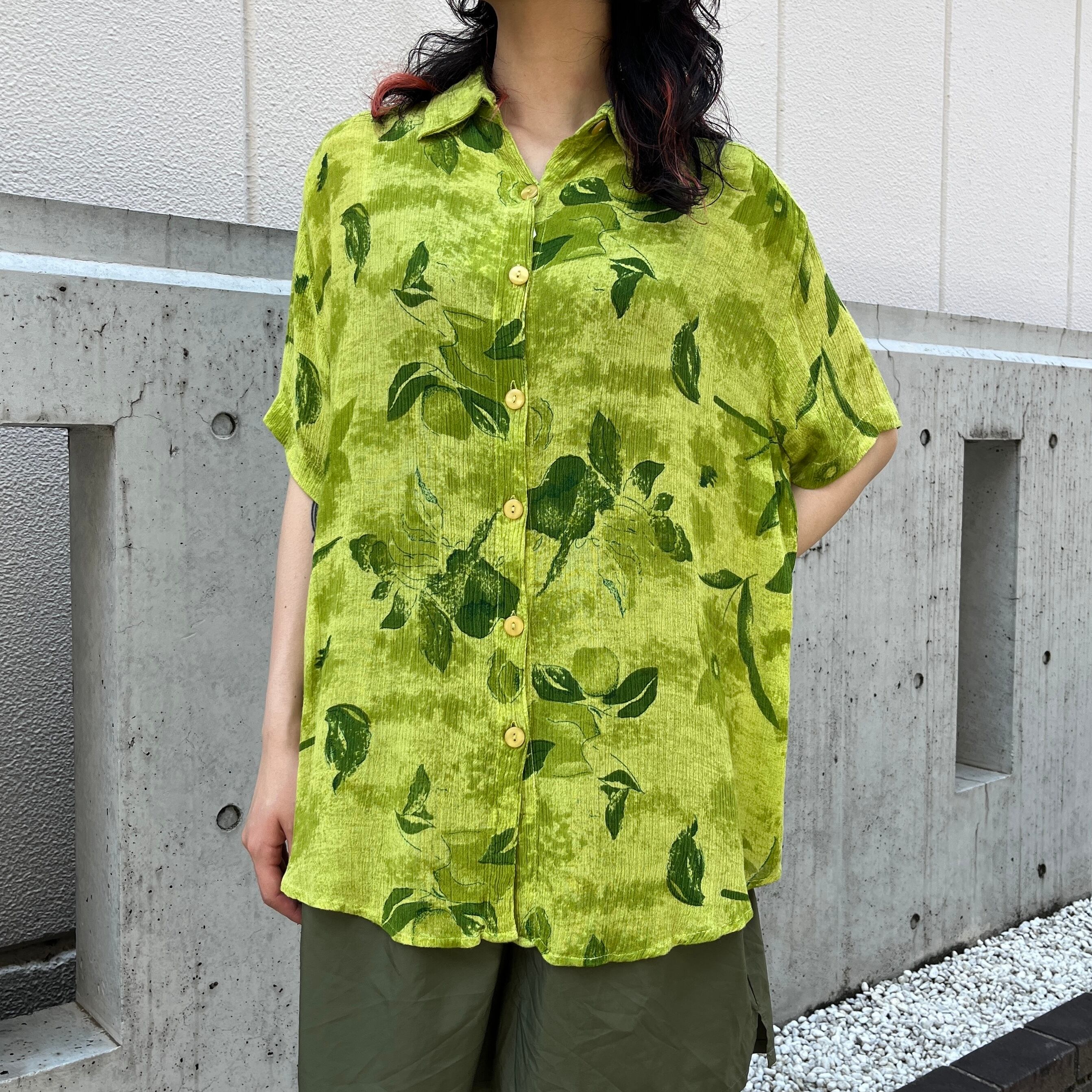 グリーンカラーをベースにした花柄の半袖シャツ。