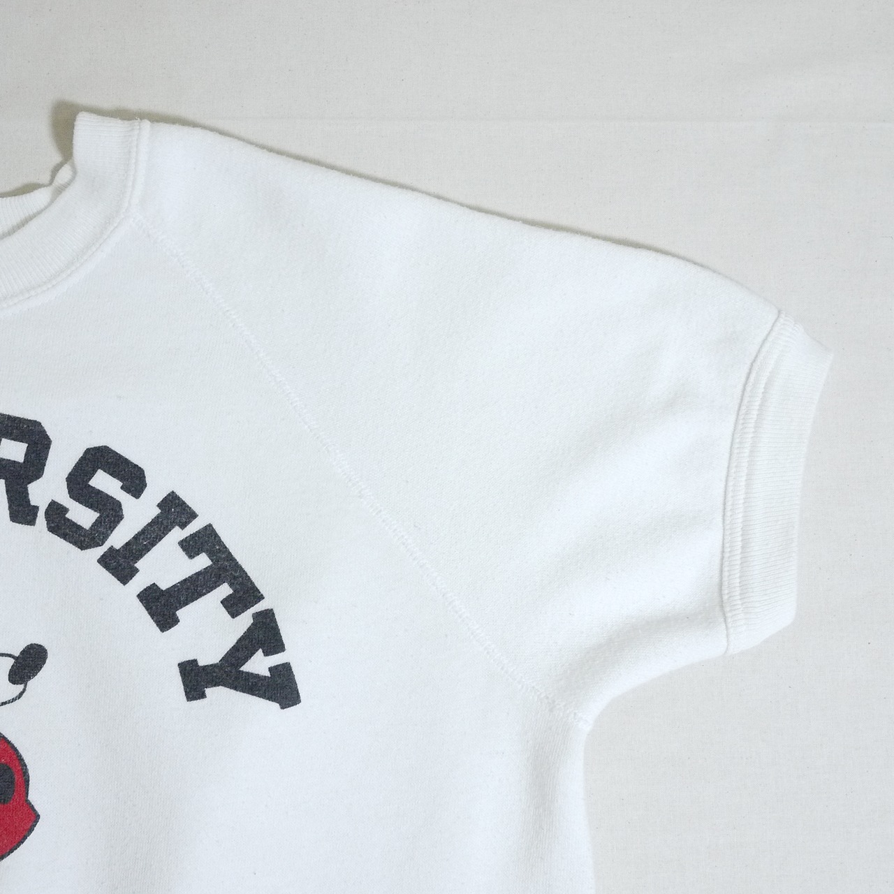 ホワイトカラーのボディにカレッジらしいプリントの半袖スウェット。