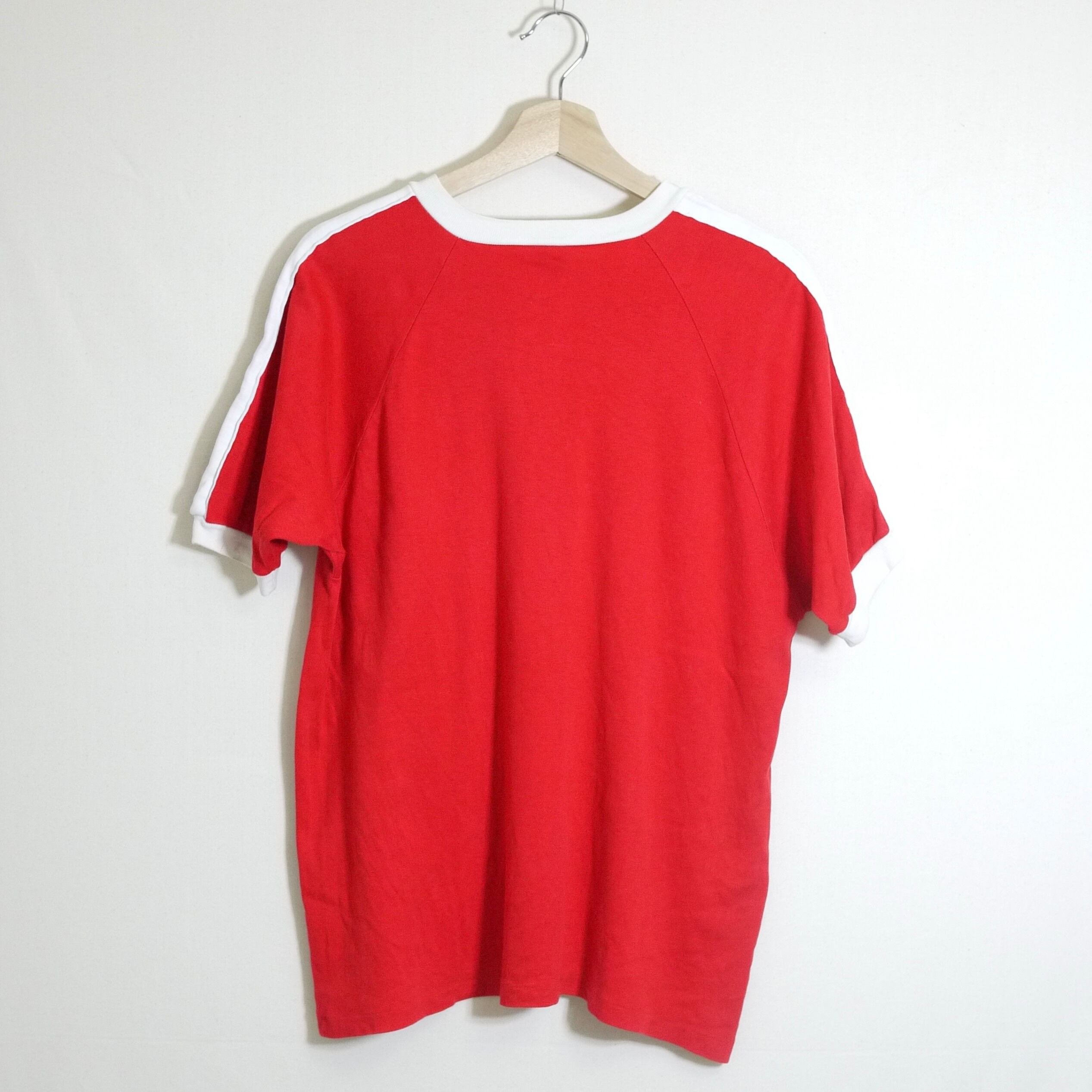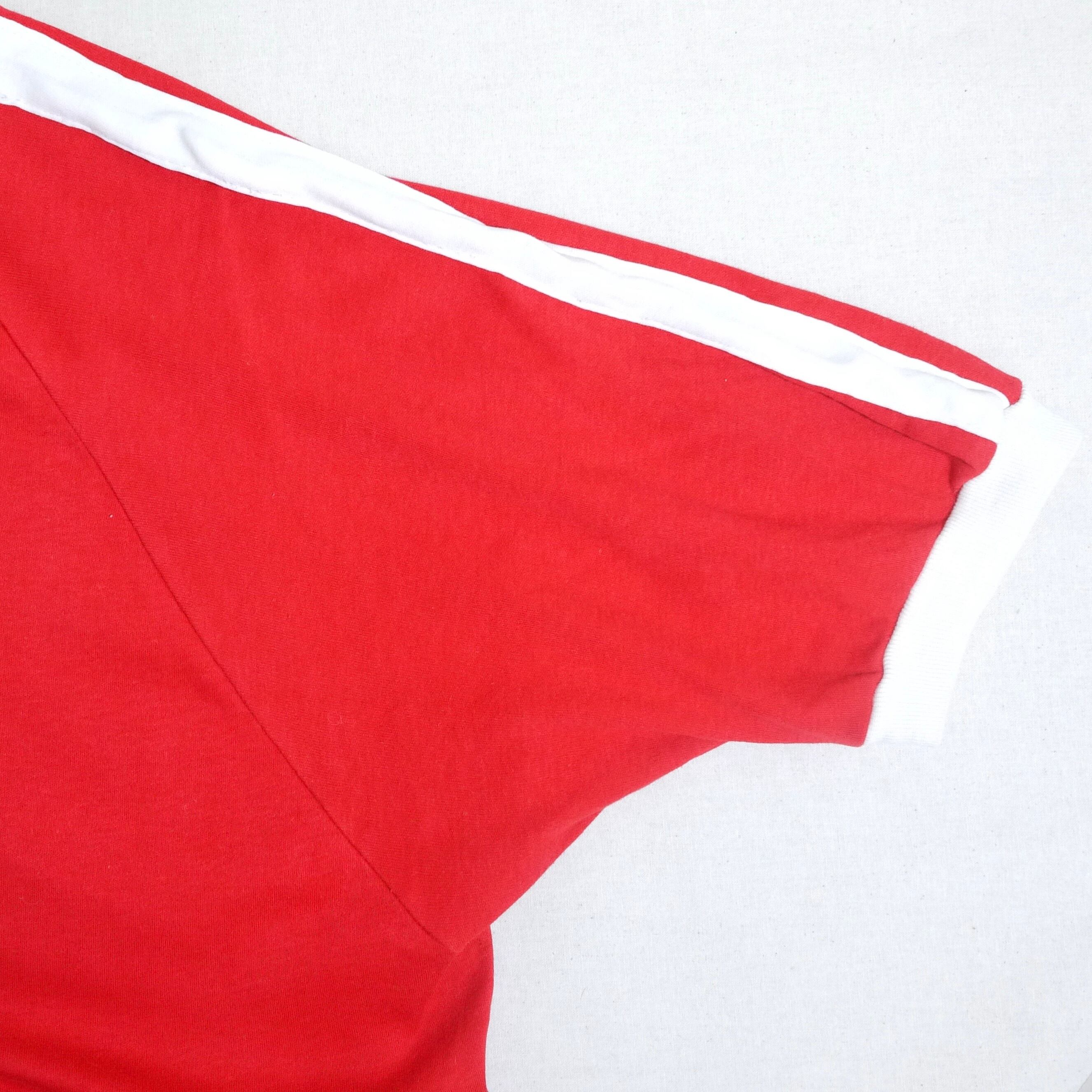 レッドカラーのボディのヘンリーネックTシャツ。