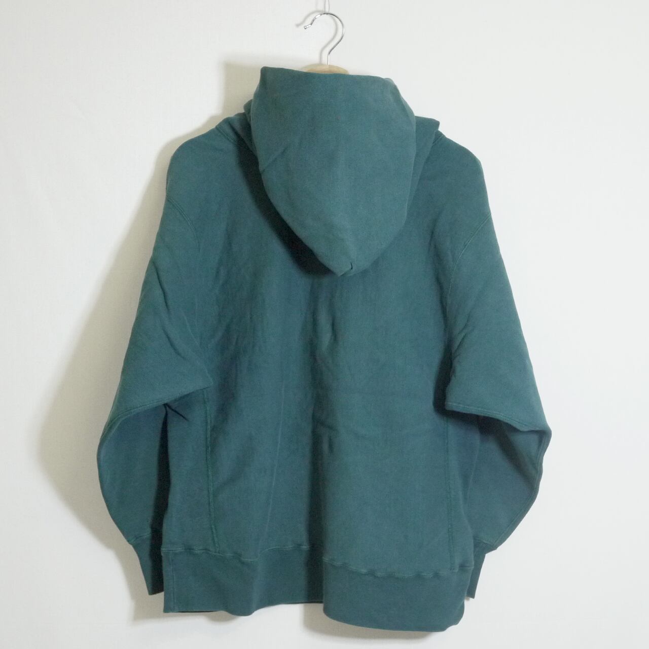 落ち着いたグリーンカラーのボディにカレッジプリントのリバースウィーブパーカ。