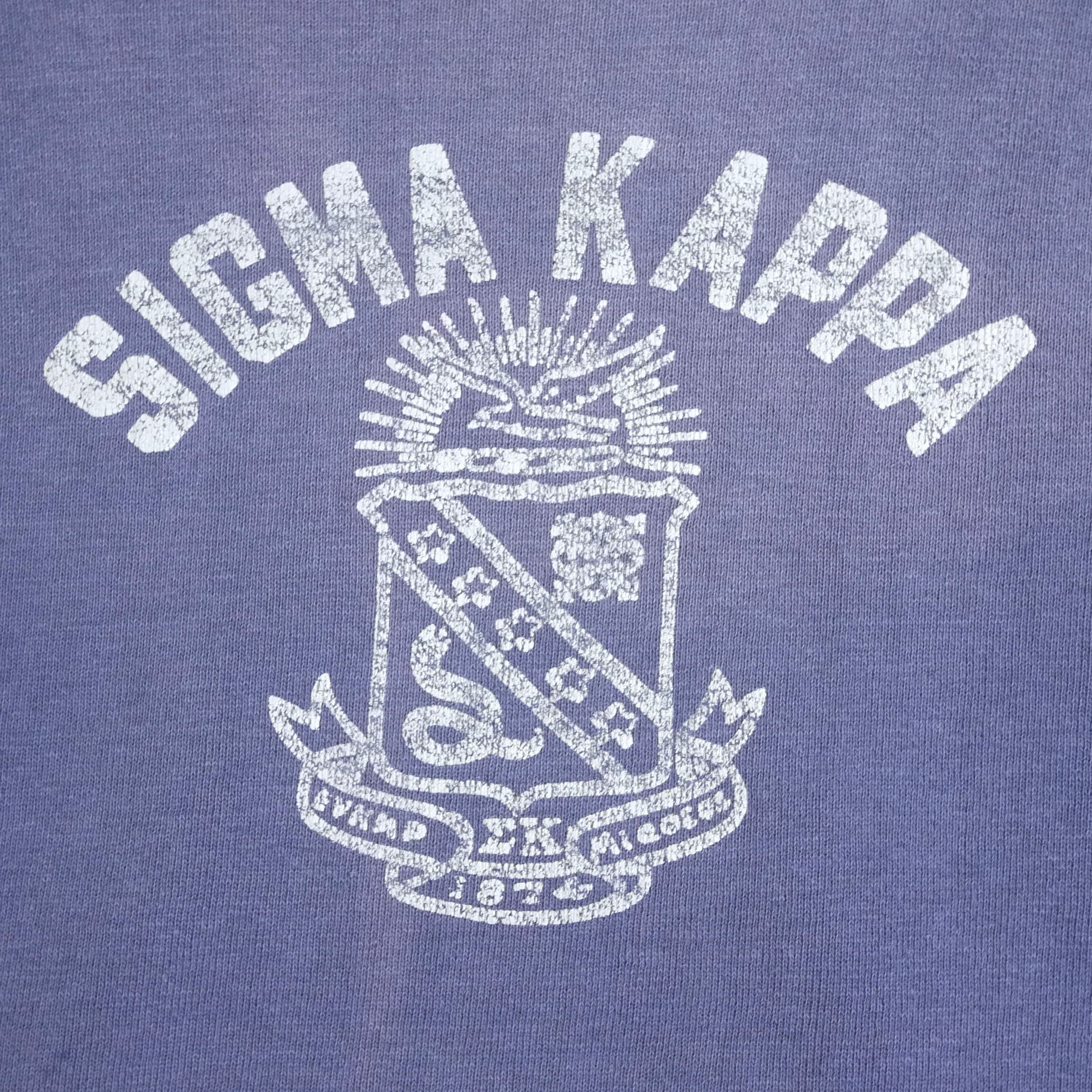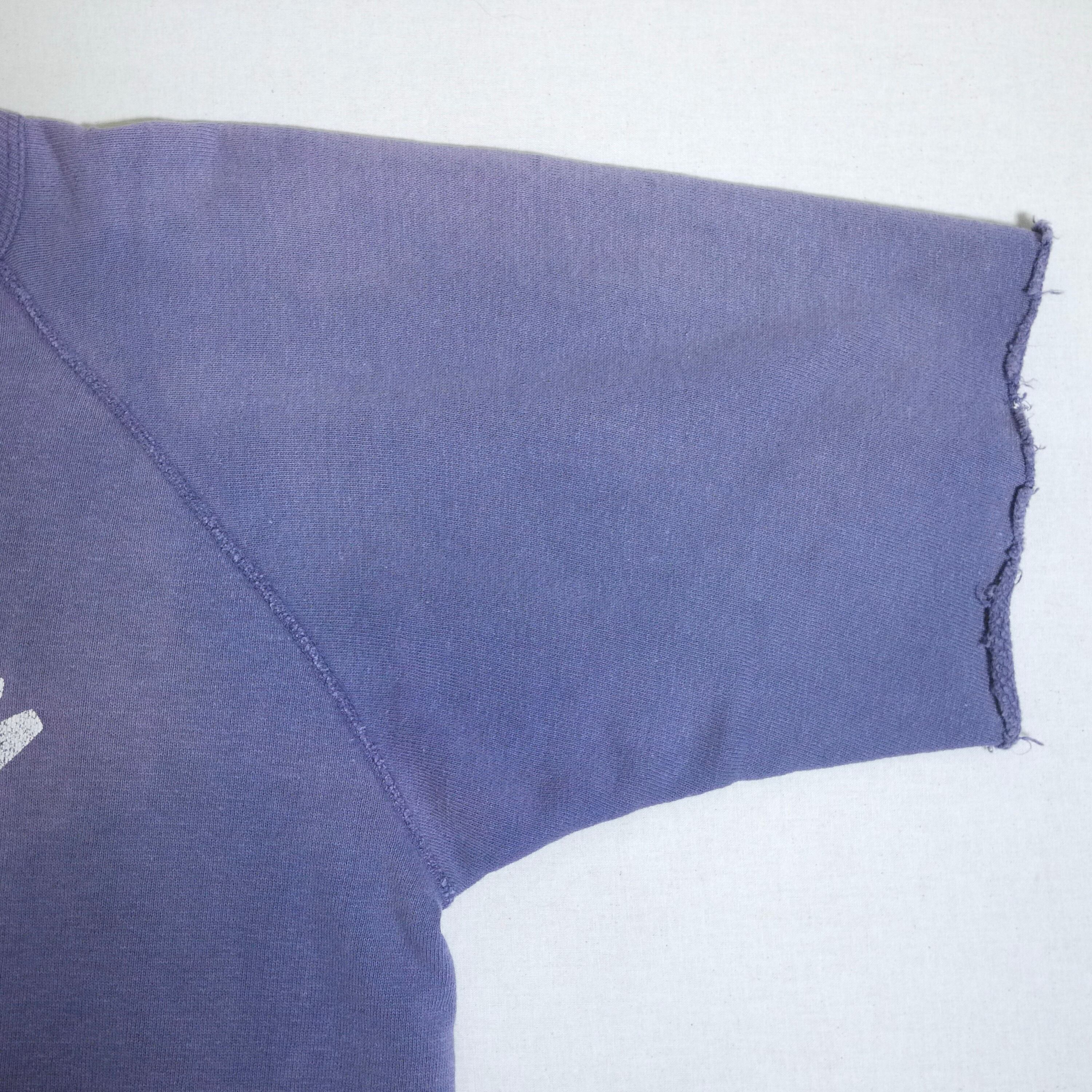 ネイビーカラーが色あせたボディにカレッジプリントのカットオフスウェット。