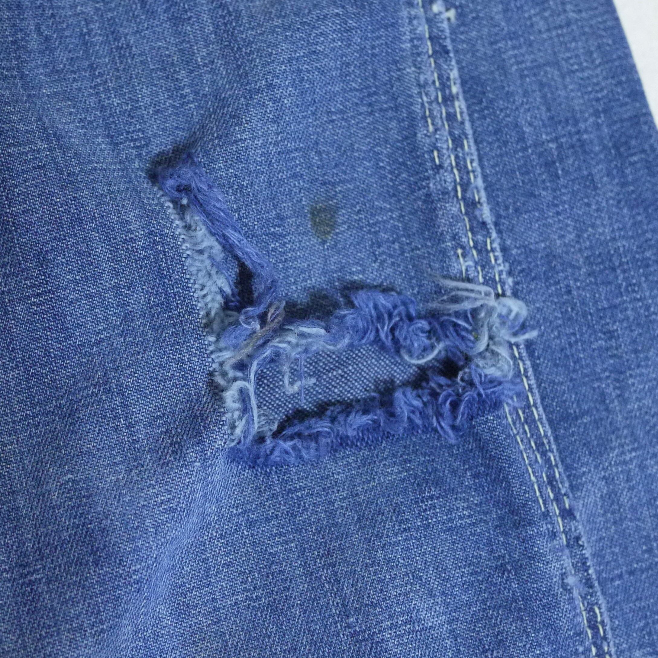 状態は、所々にリペアとダメージ。左膝のダメージは少し大きめ。左腰のボタンは欠損していて、紐を通す仕様へ変更するために縫い合わせています。その他、経年による使用感がありますが、着用に問題はありません。