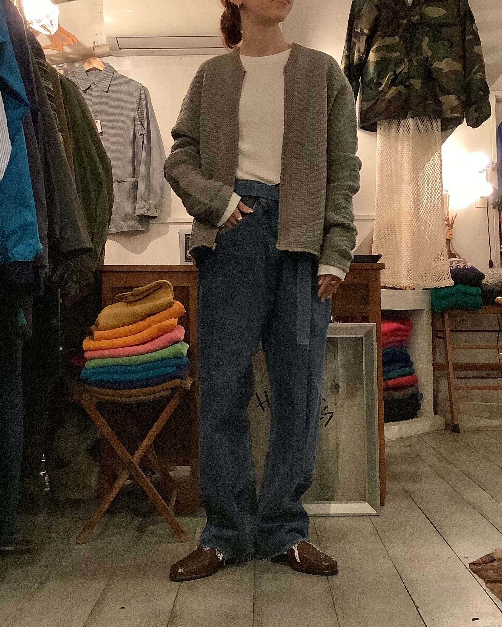 特有の雰囲気やシルエットを残し、ウエストにデニム地のベルトを付け、ラップデニムパンツへアップデート。
