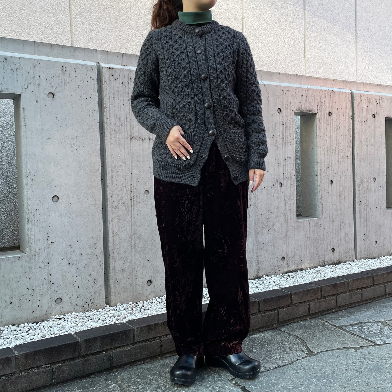 チャコールグレーカラーのクルーネックカーディガン。