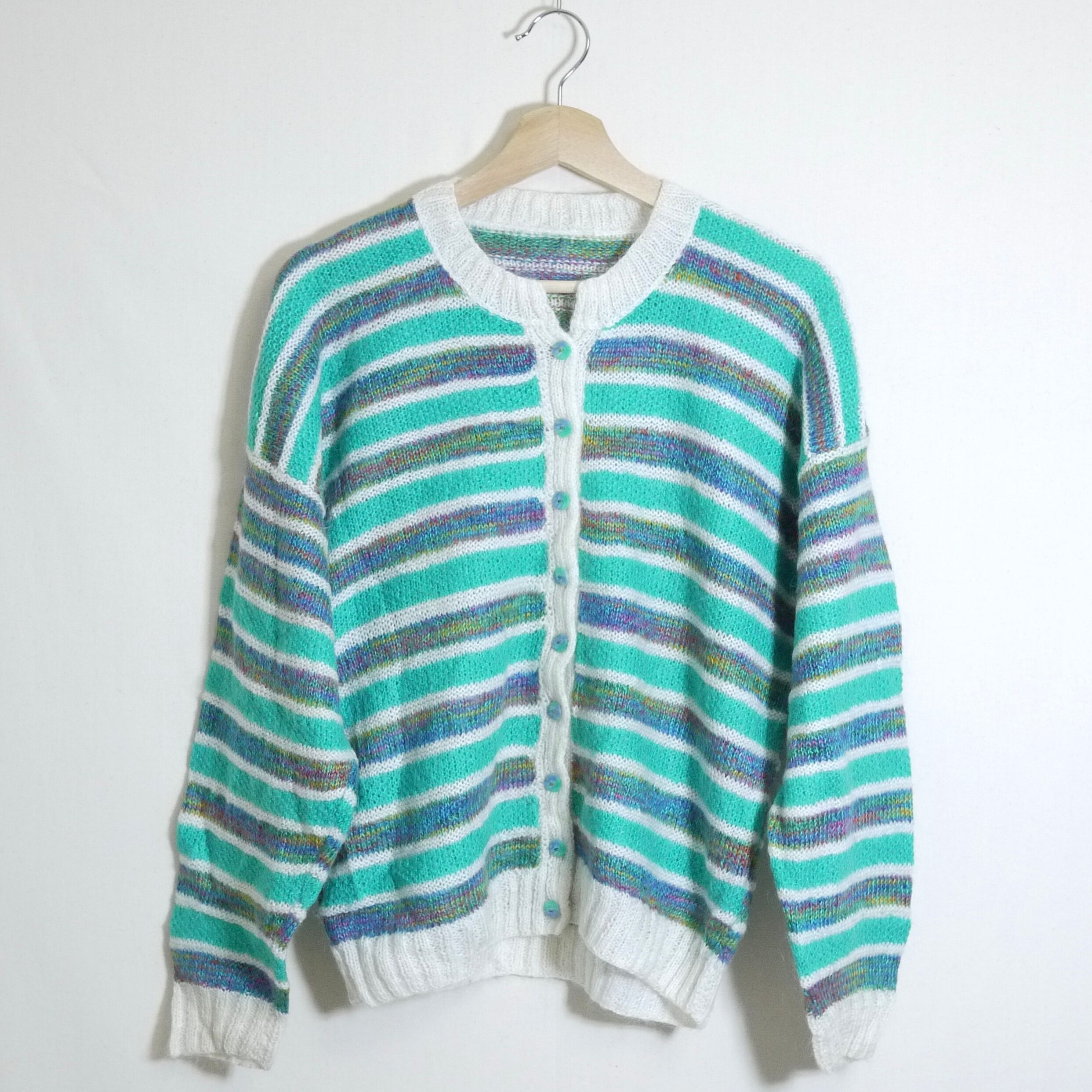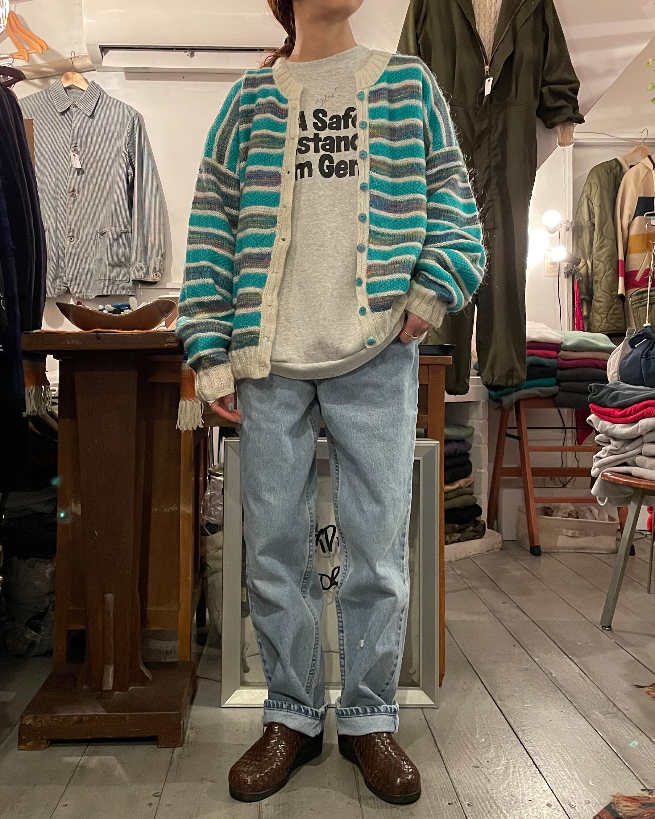 グリーン系カラーのボーダー柄が印象的なニットカーディガン。
