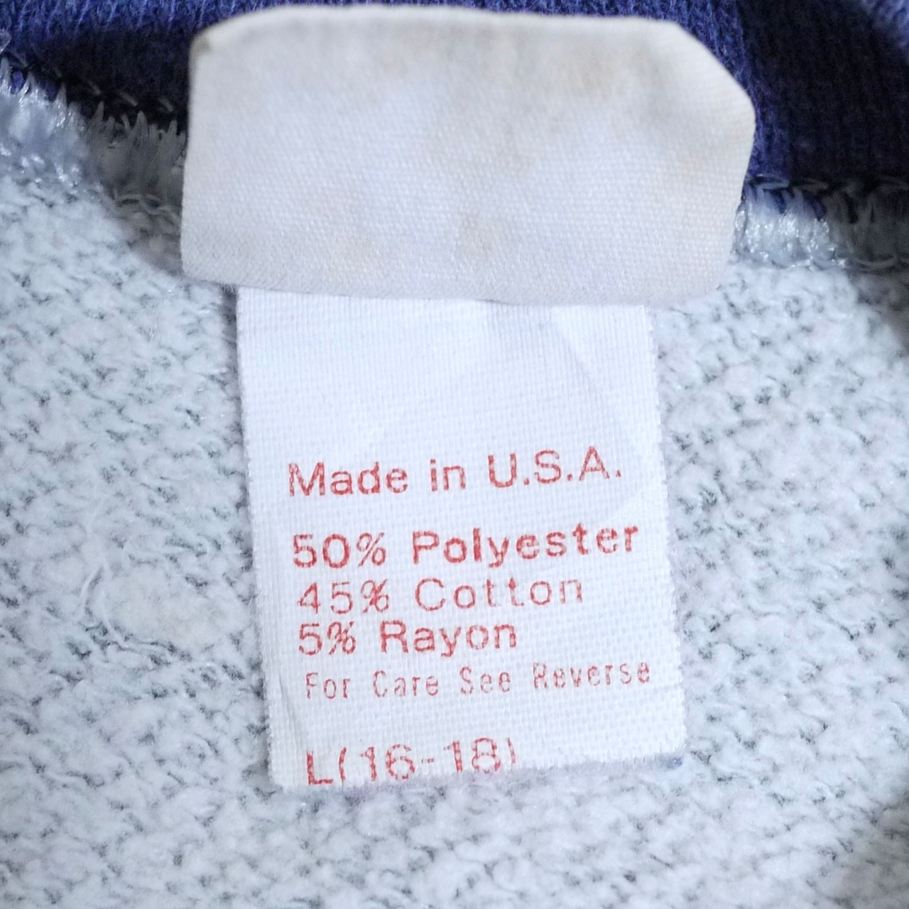 アメリカ製。ポリエステル50%、コットン45%、レーヨン5%。