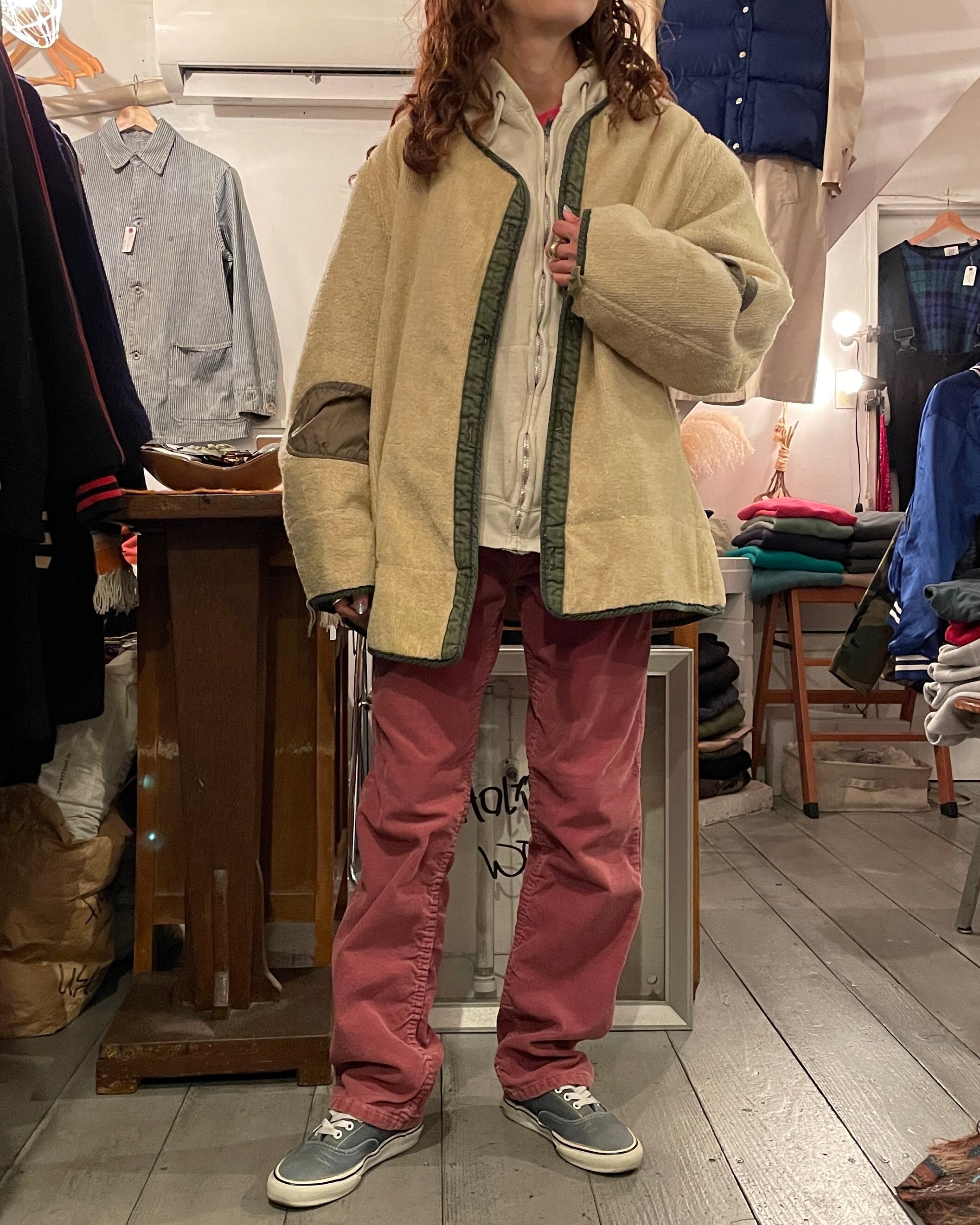 落ち着いたパープルカラーのコーデュロイパンツ。