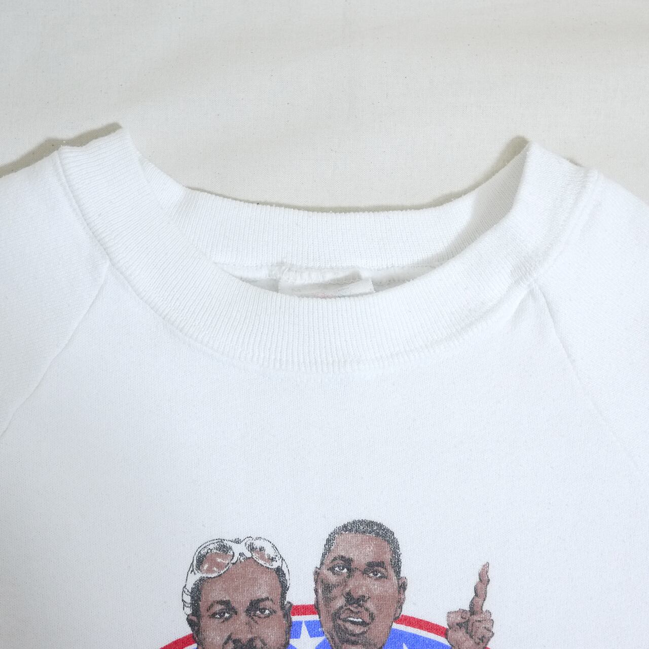 状態は、右袖と前身頃のプリント周辺に薄らシミ。その他、全体的に経年による使用感は多少ありますが、目立った汚れやダメージはなく着用に問題はありません。
