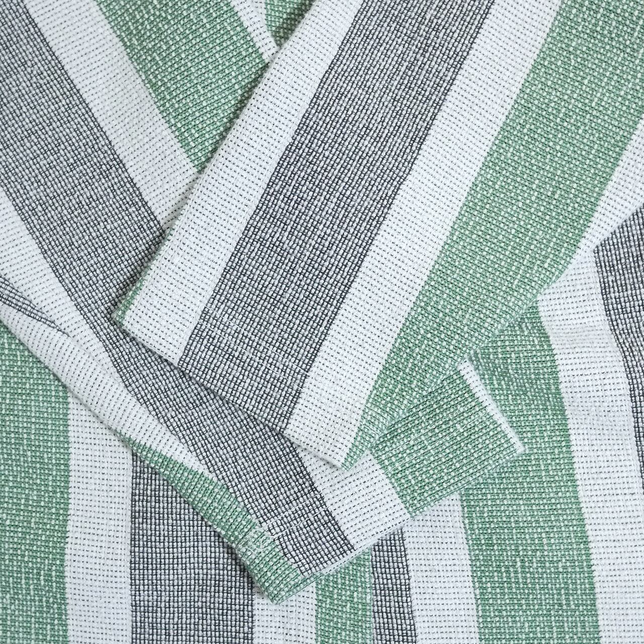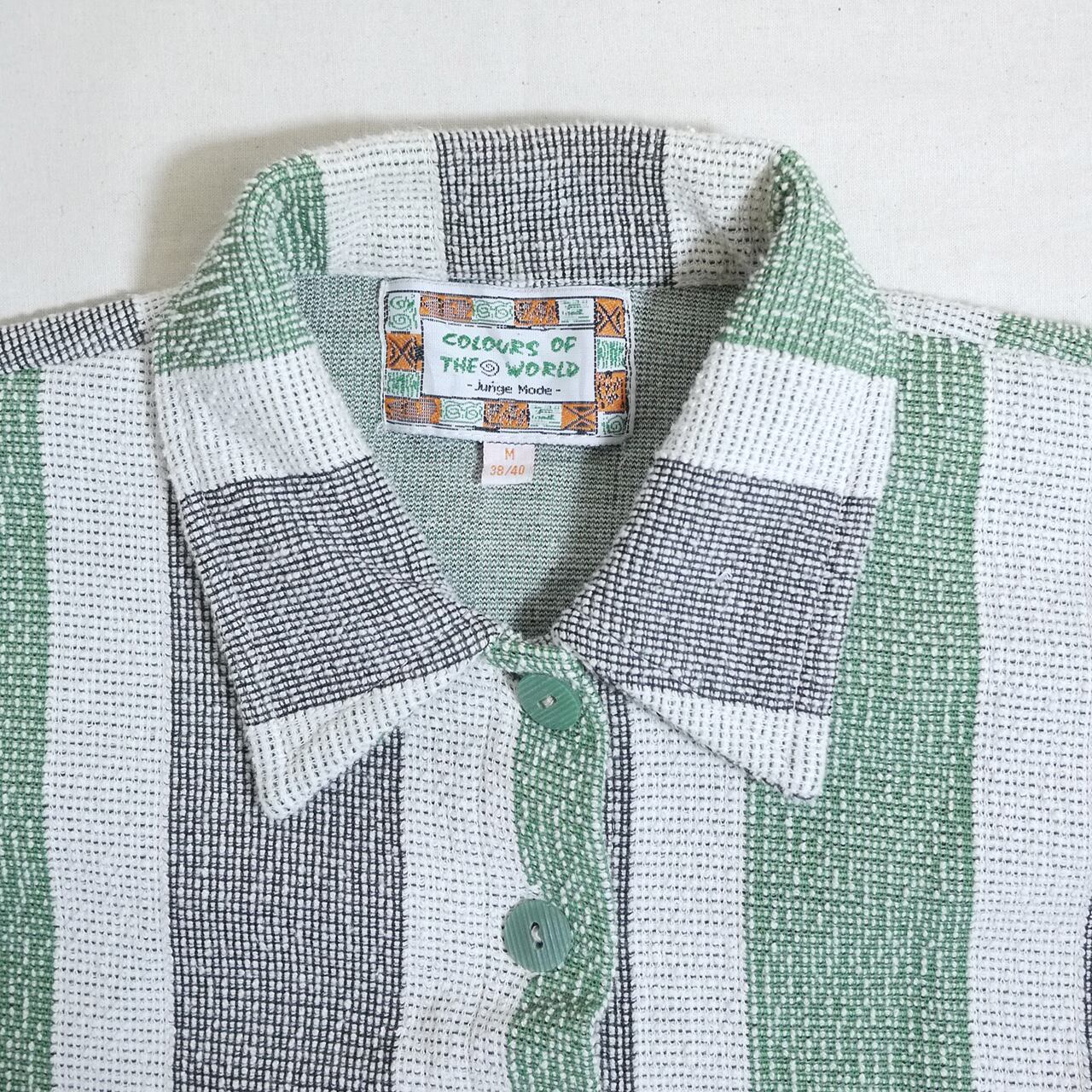 ブラック、グリーン、ホワイトのストライプ柄のシャツ。