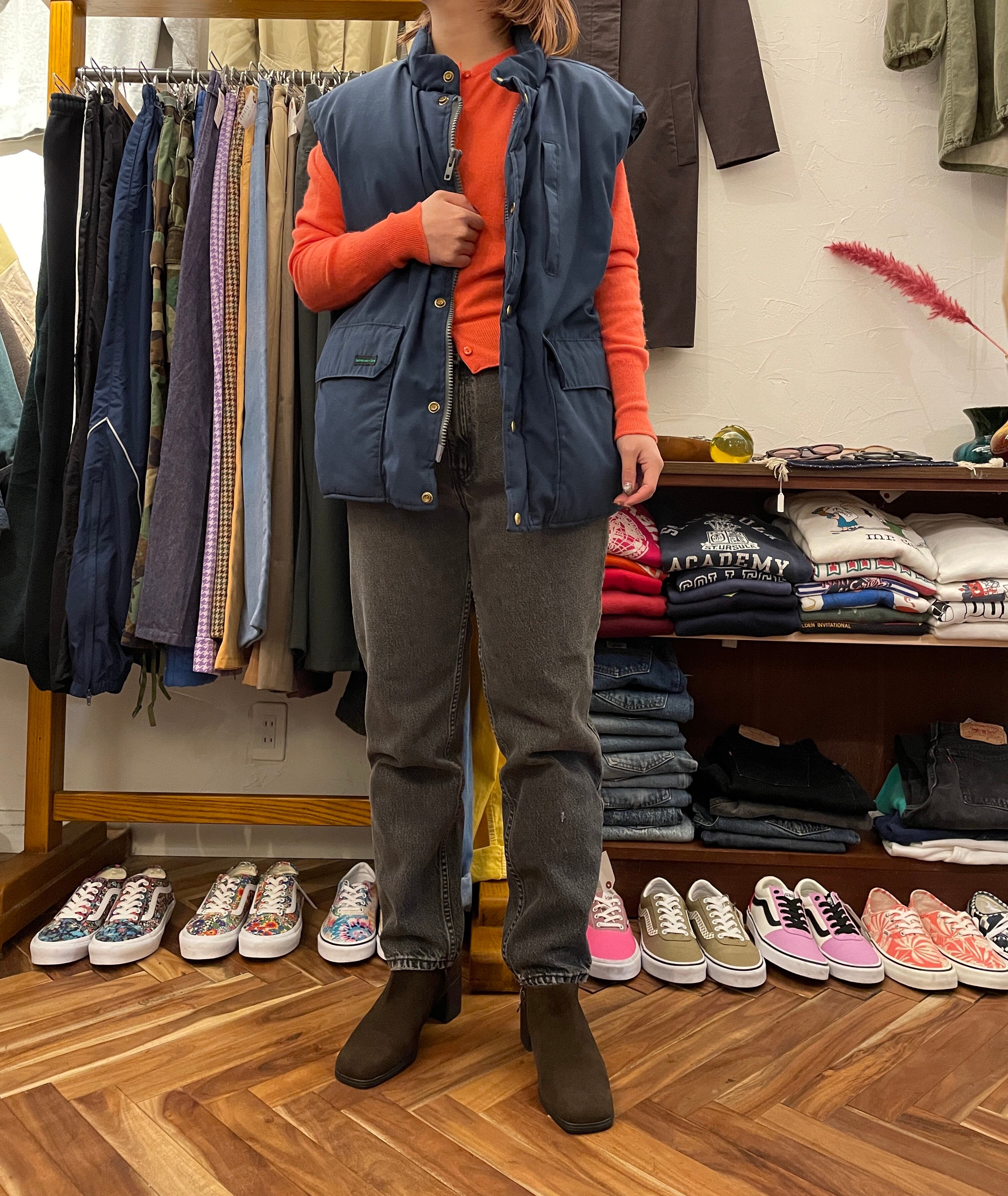 合わせやすいネイビーカラーのダウンベスト。