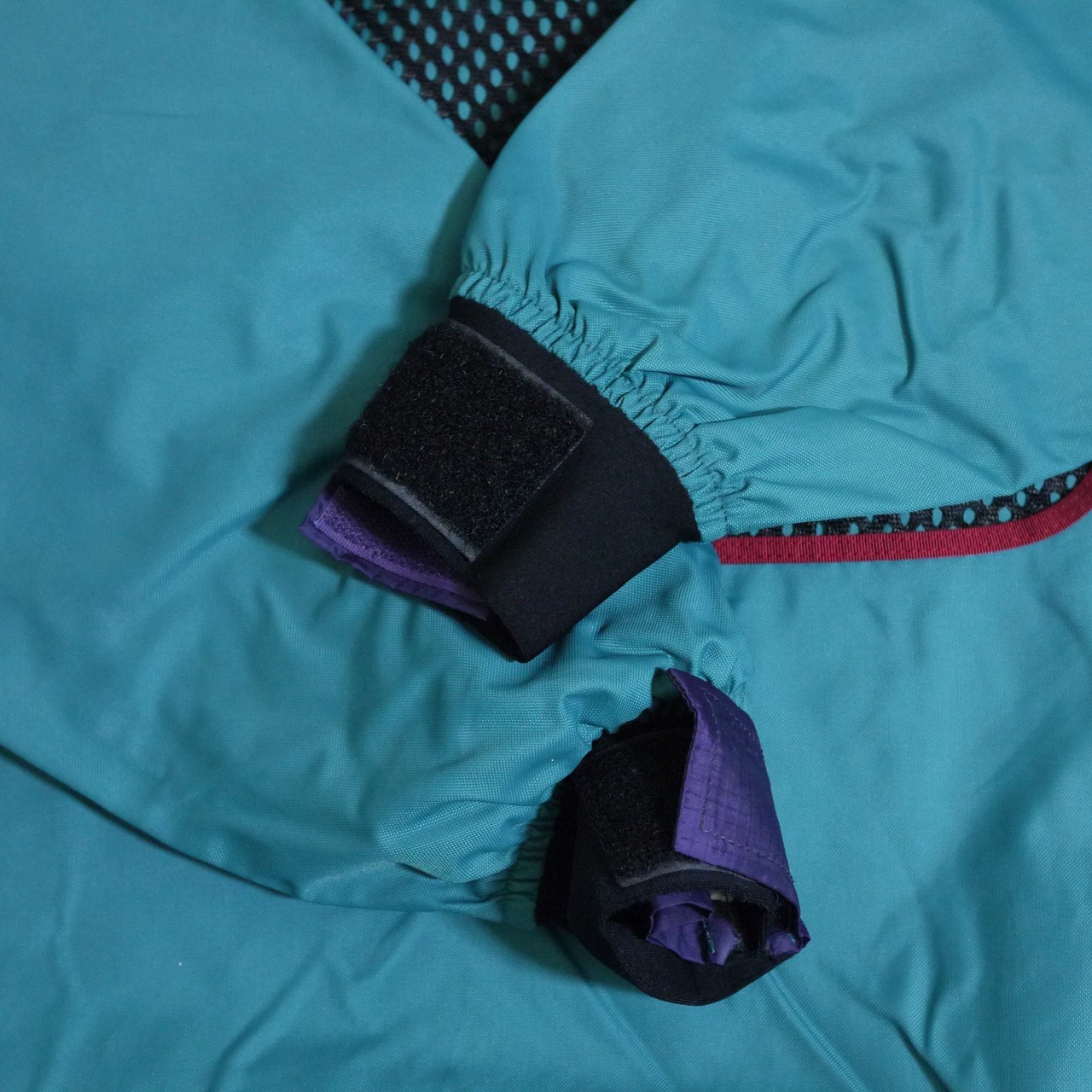 ネックと袖口は水の浸入を防ぐウェットスーツ素材でベルクロ留め。裾にドローコードも付きます。