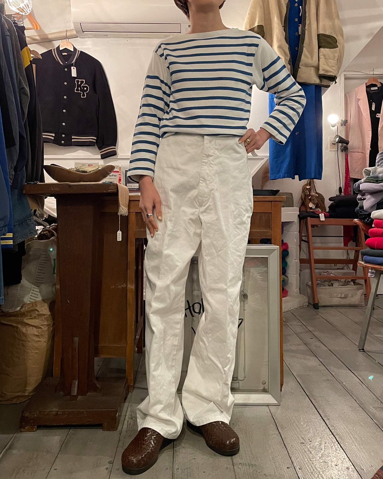 ホワイト×ブルーの長袖Tシャツ。