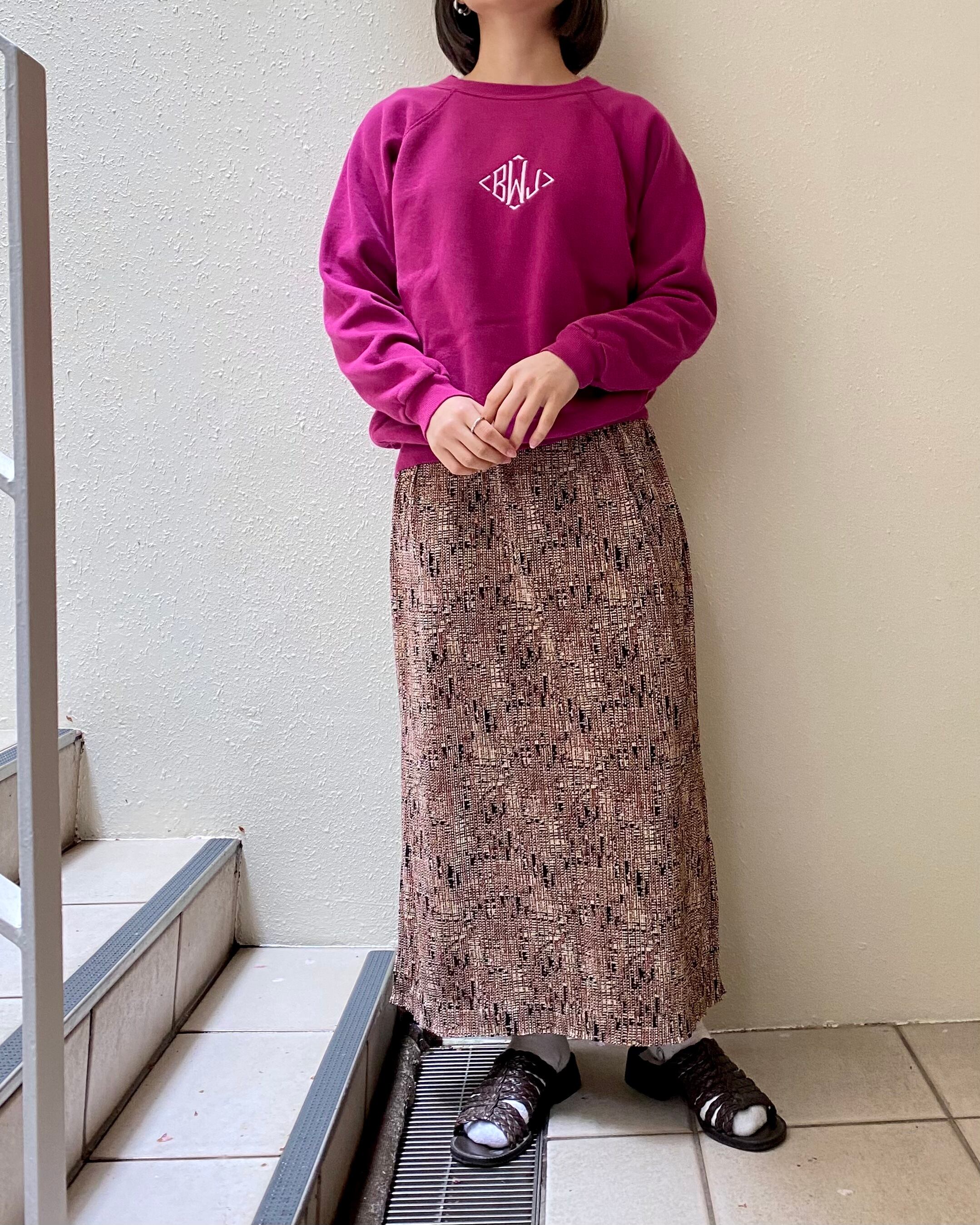程よくゆとりがあり、上にも下にもレイヤードしやすいサイズ感でした。薄めの裏起毛で着心地が良いです。古着らしい絶妙なカラーにシンプルな刺繍デザインが◎!