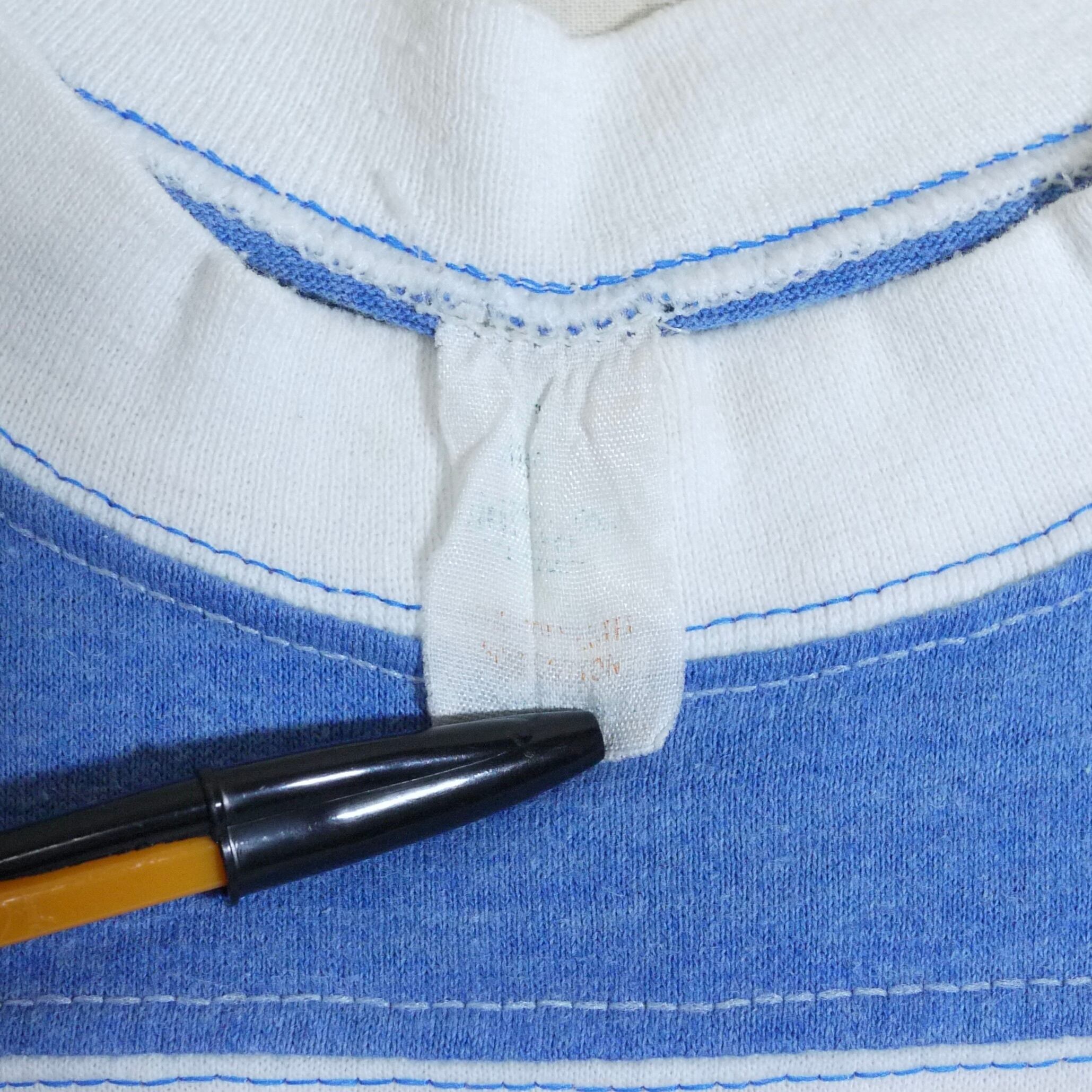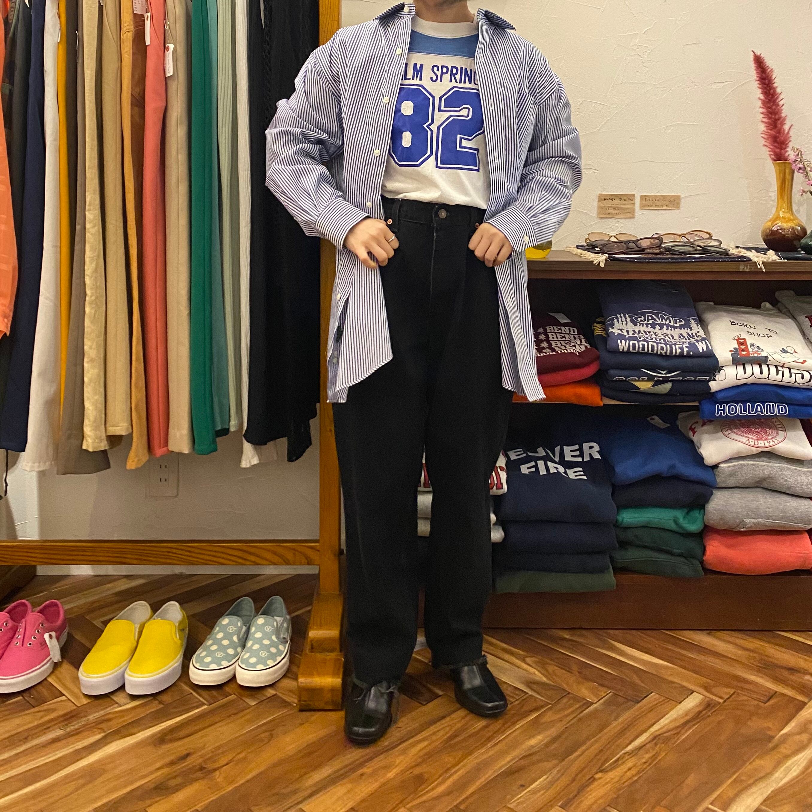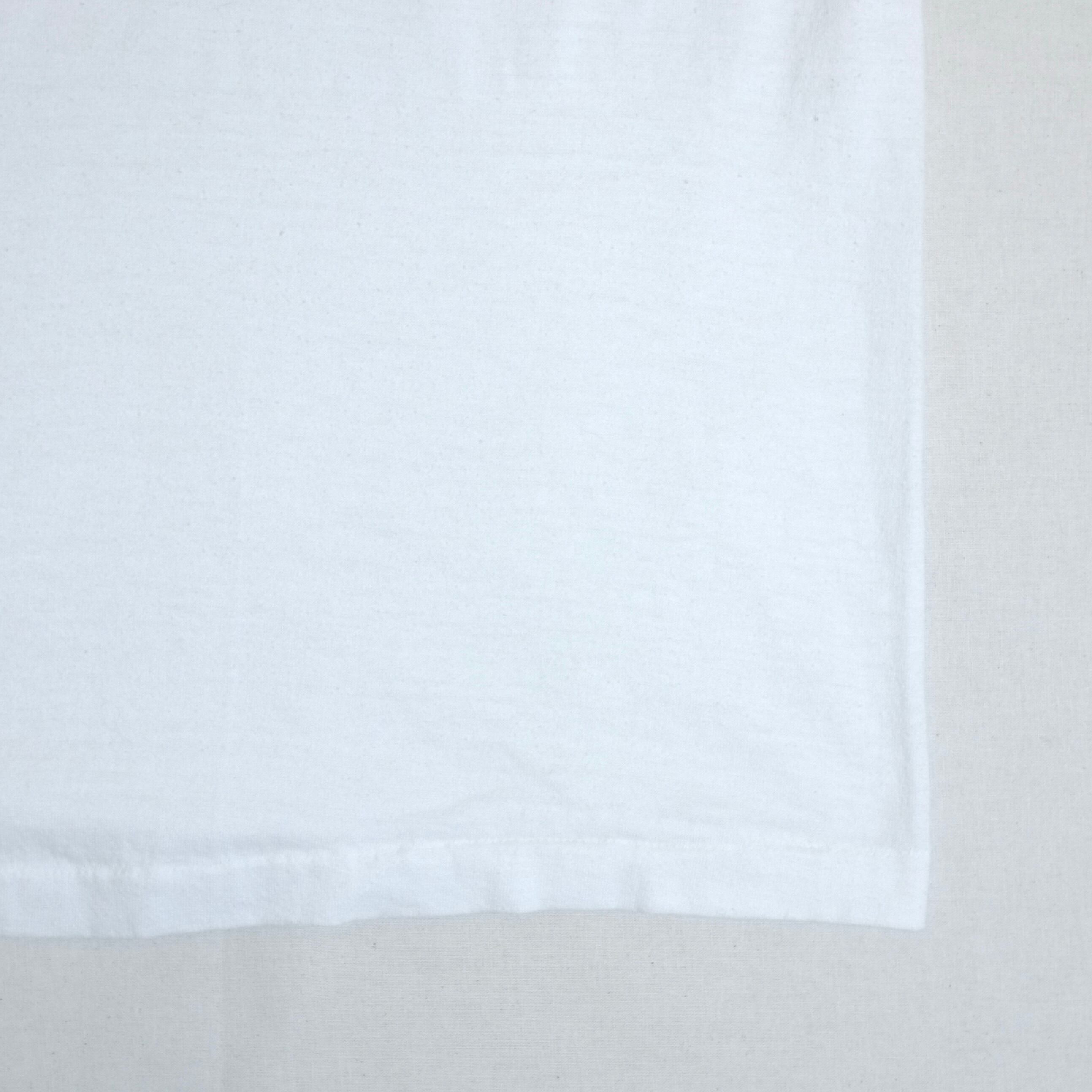 全体的にジャストなサイズ感で、袖周りが腕にフィットするシルエットです。裾はタックインしてもごわつかない長さで、インでもアウトでも着用いただけます。経年変化により生地が若干薄くなりライトな着心地になっています。