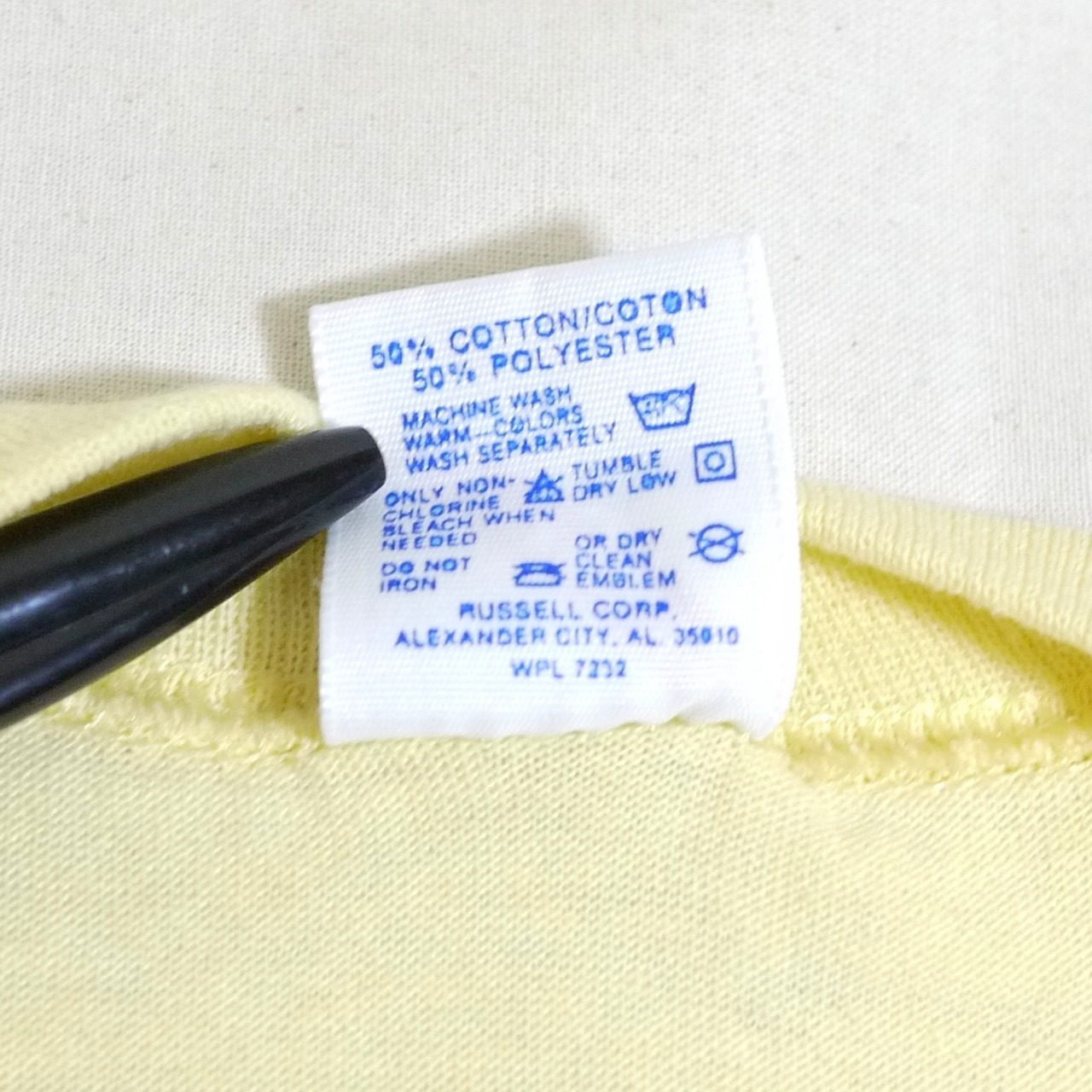 アメリカ製。ポリエステル50%、コットン50%。