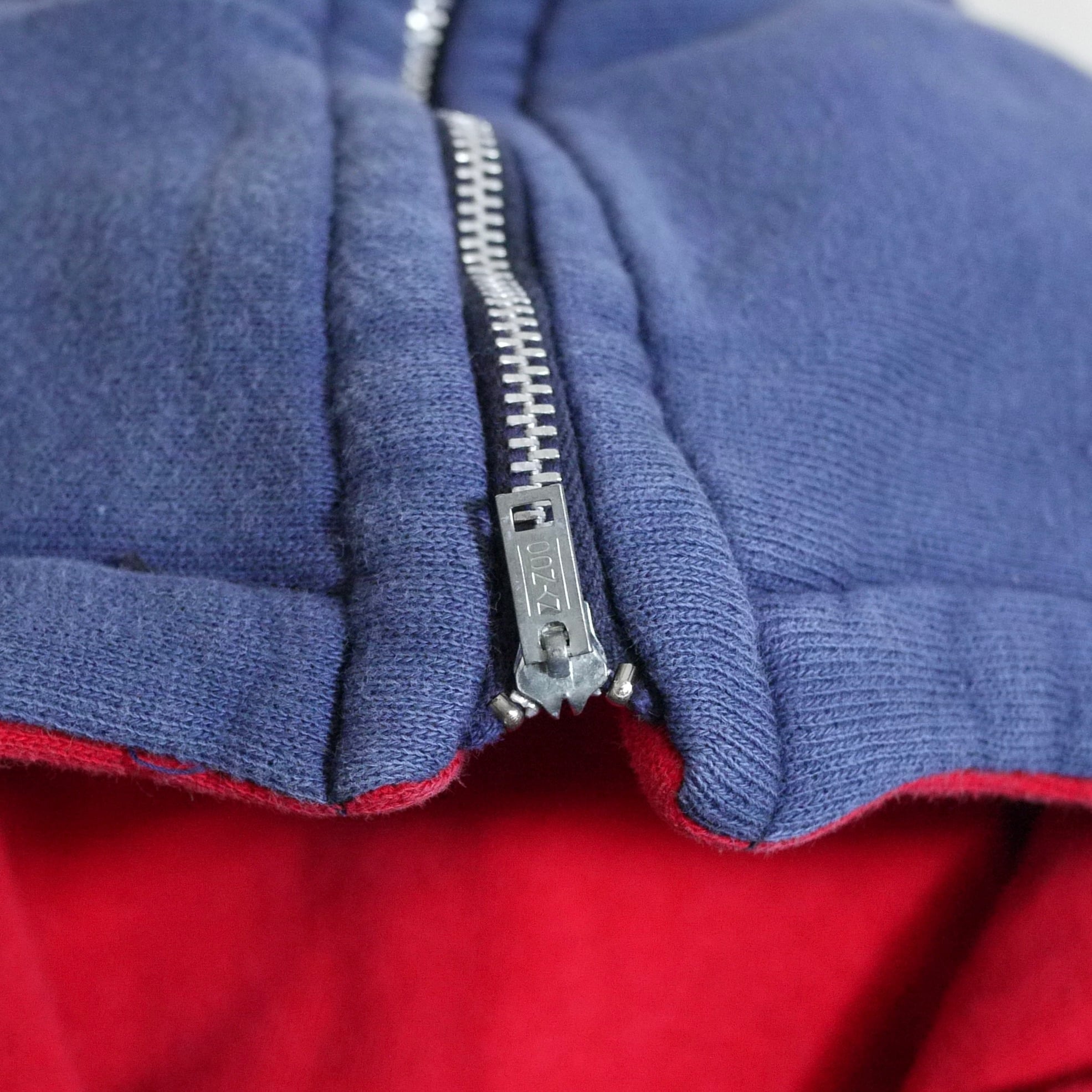 フード内側がレッドカラーの切り替えデザインになっていて、ジッパーが付きフードを開いて着用することも可能。