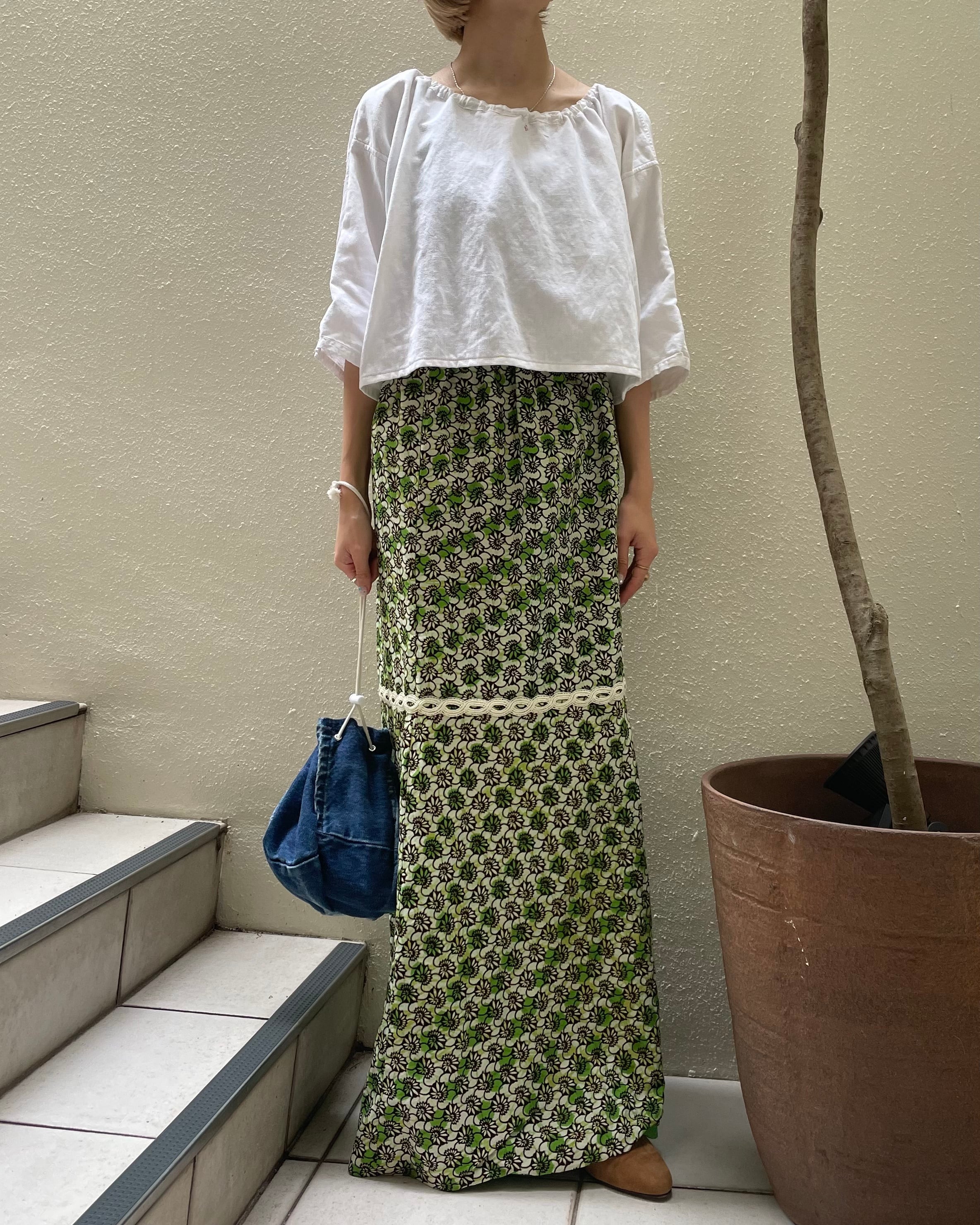 異なる色落ちのブルーデニムによるパッチワークデザイン。