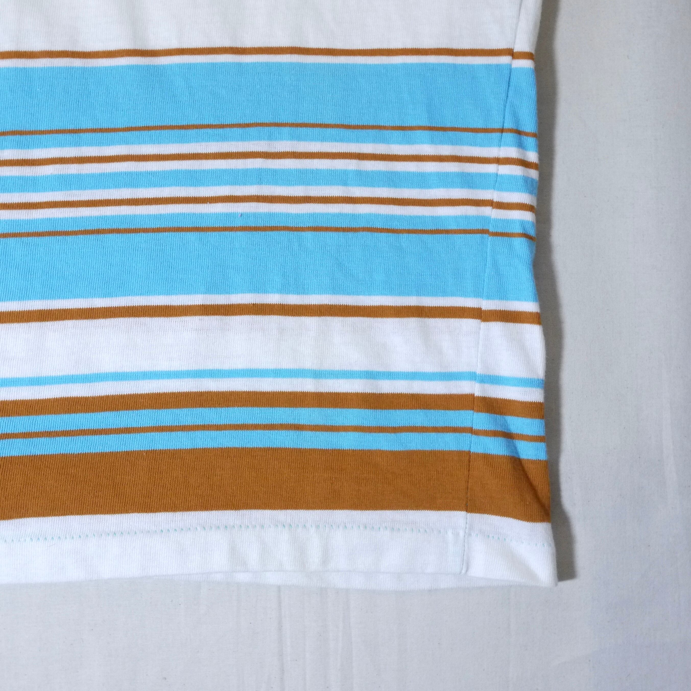 ホワイト、ライトブルー、ブラウンのボーダー柄Tシャツ。