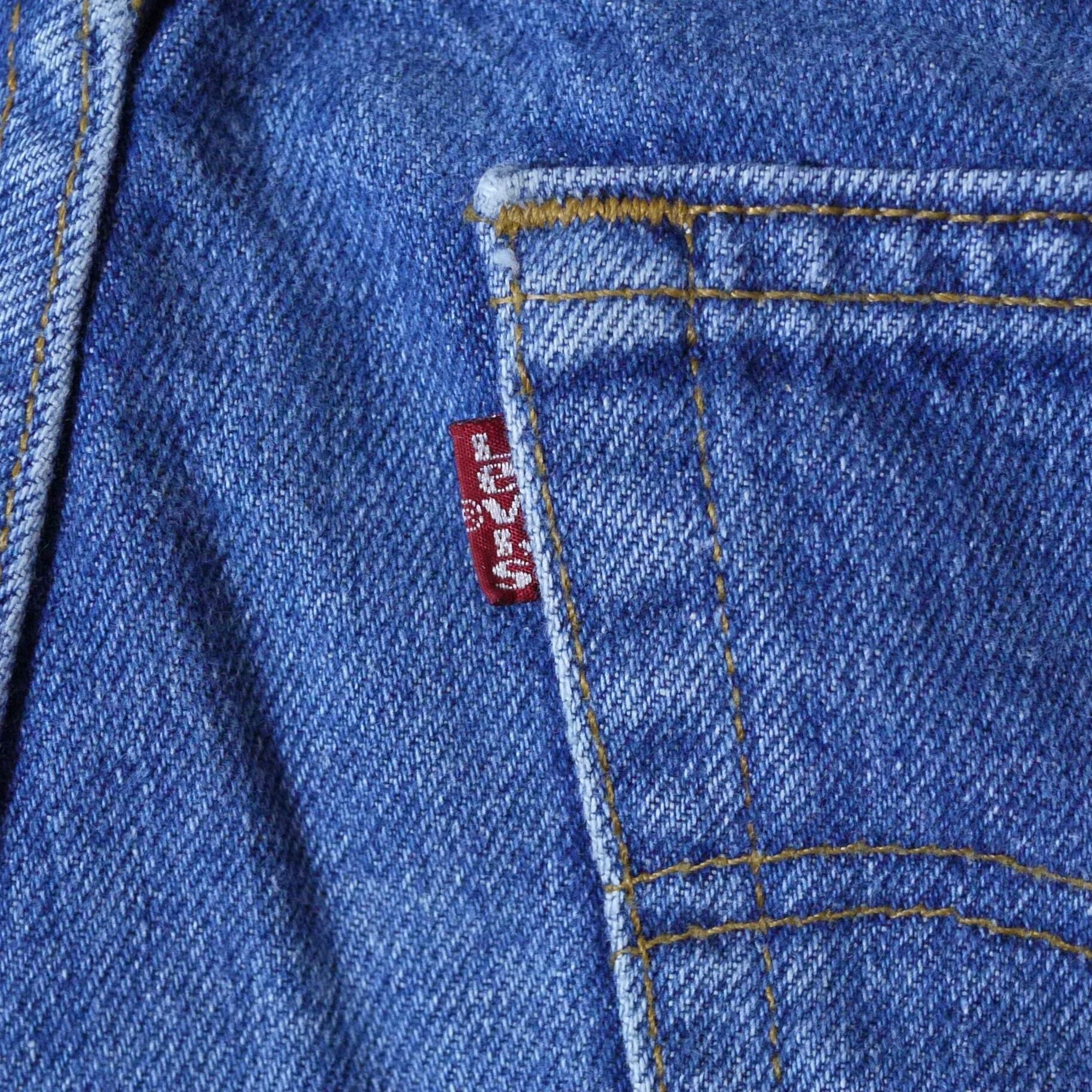 アメリカ製。コットン100%。赤タブスモールe。ボタン裏刻印575。ブランド刻印入りのジッパー。