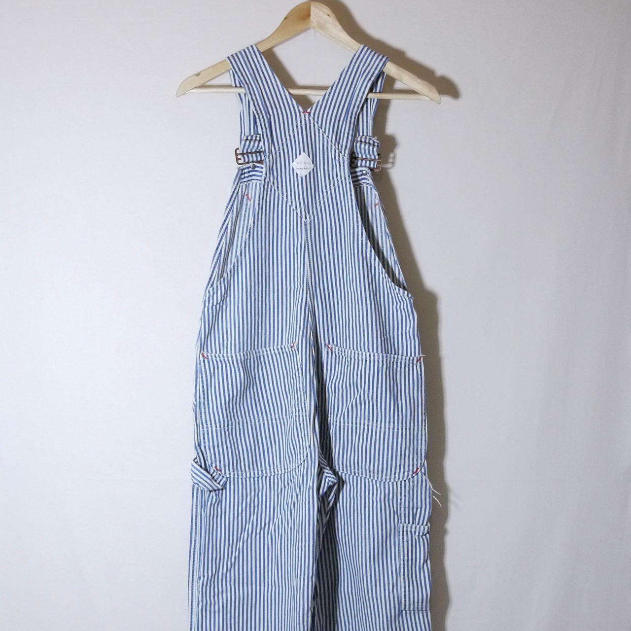 ピッチの太いヒッコリーストライプのオーバーオール。