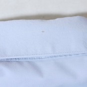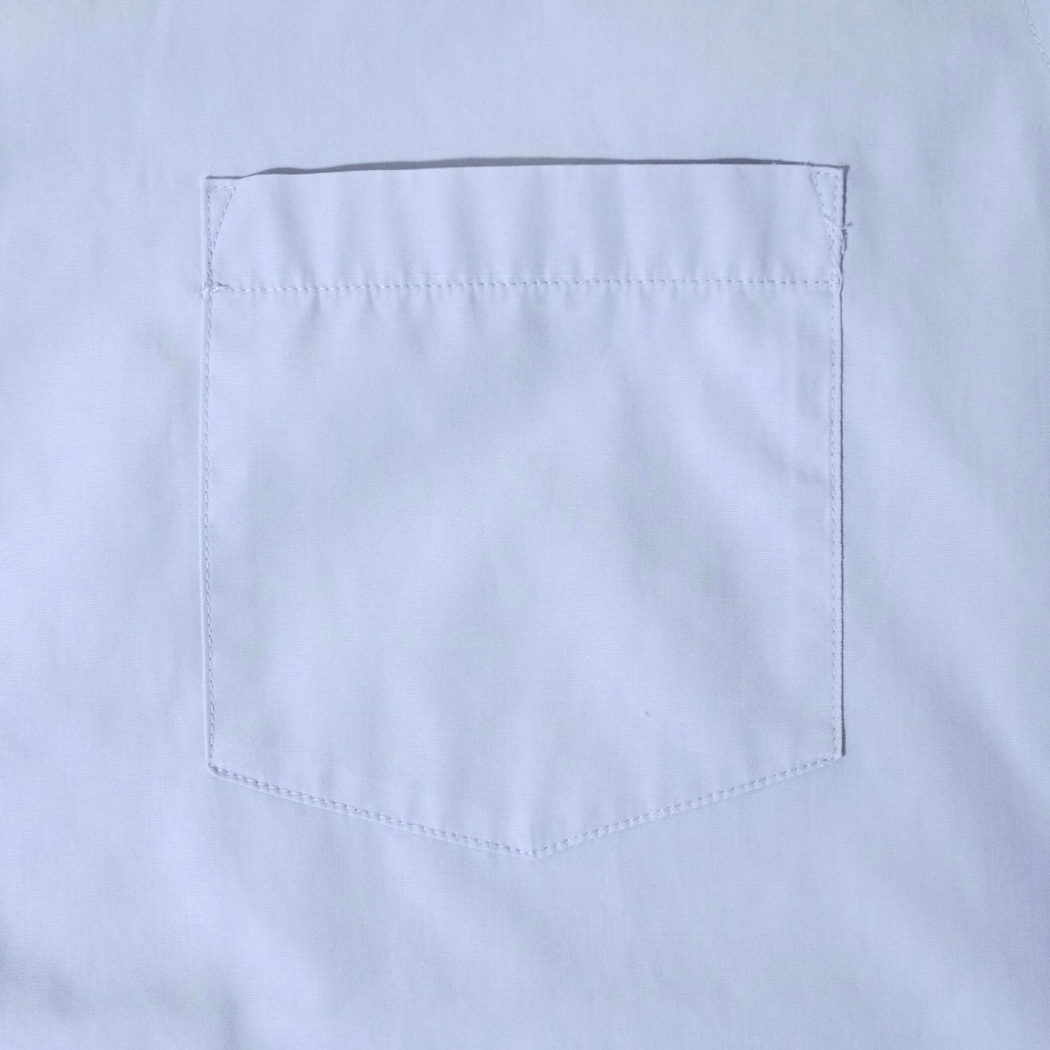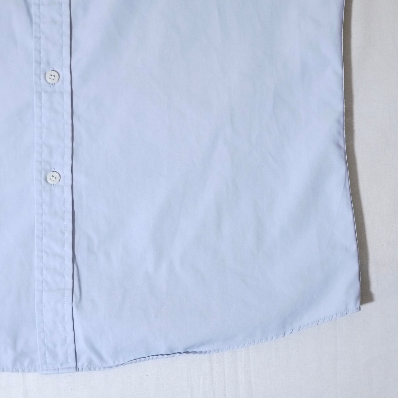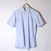 グレーとブルーの中間のようなカラーの半袖シャツ。