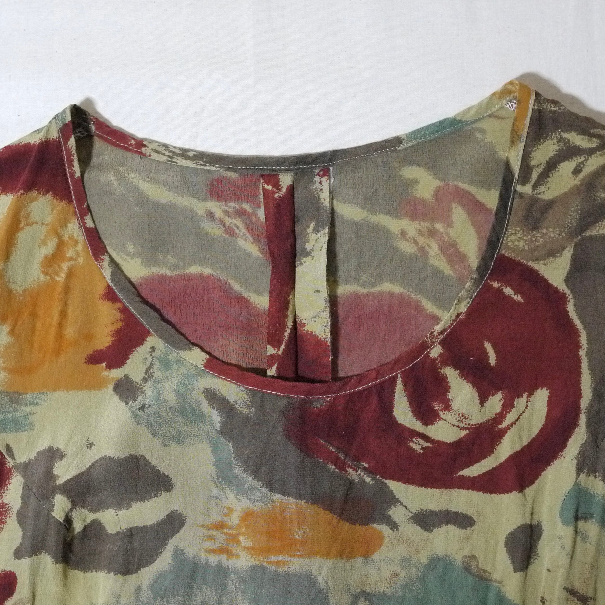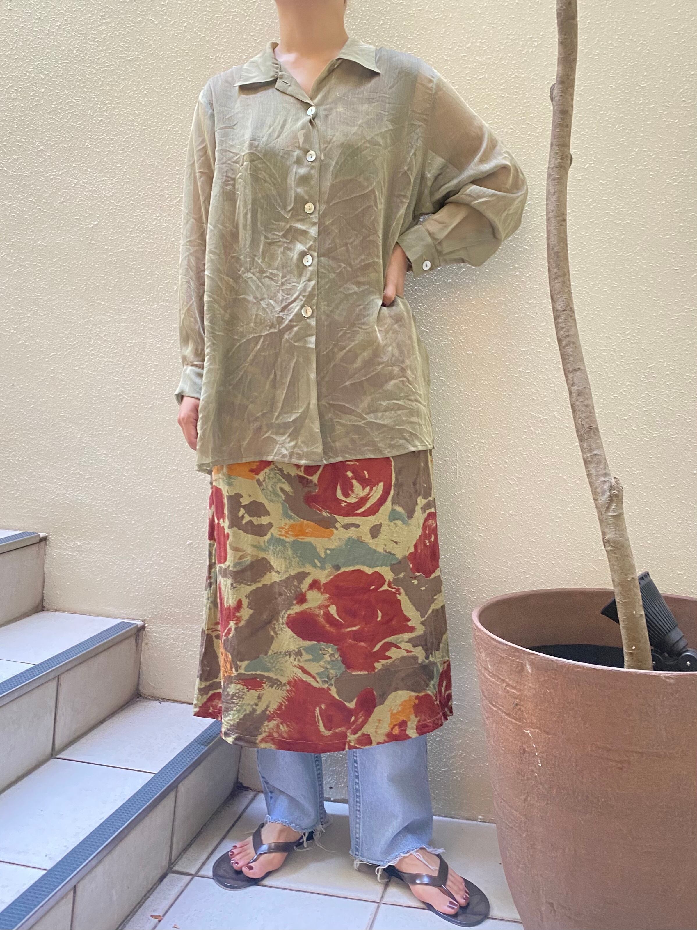 オリーブカラーがベースの総柄ワンピース。