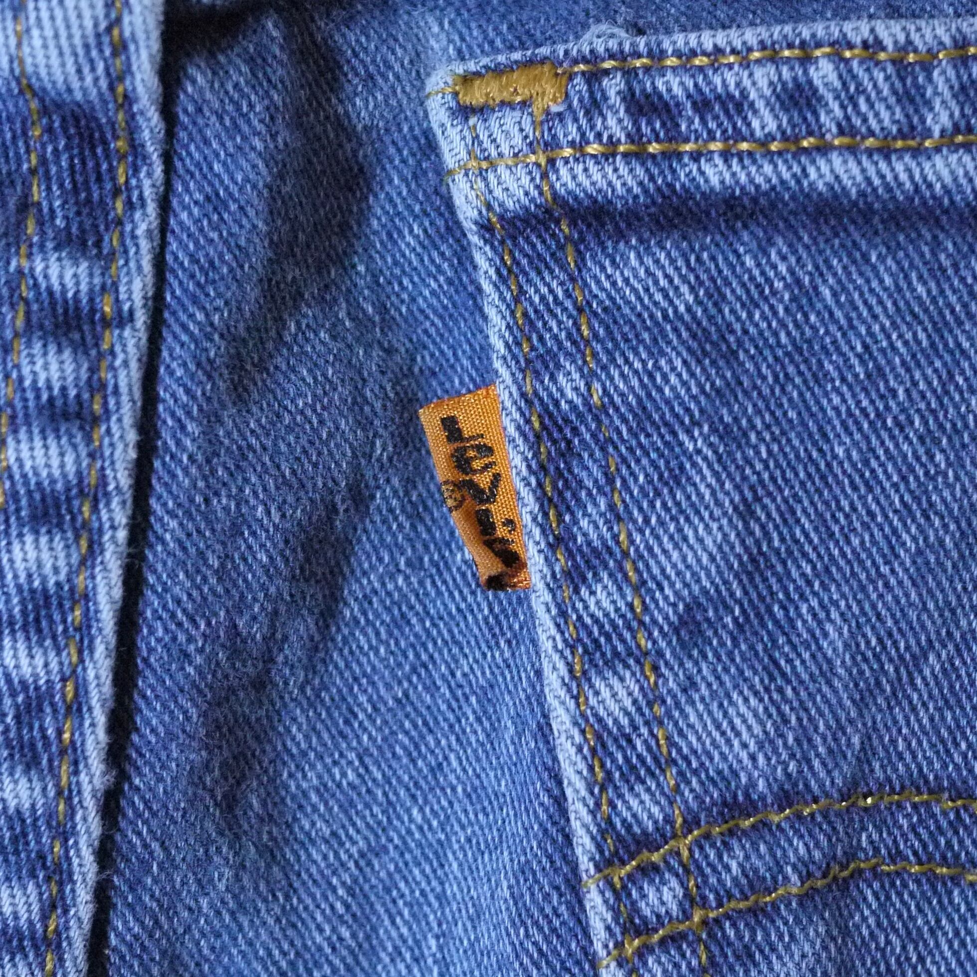 アメリカ製。コットン100%。オレンジタブスモールe。トップボタン裏の刻印573。