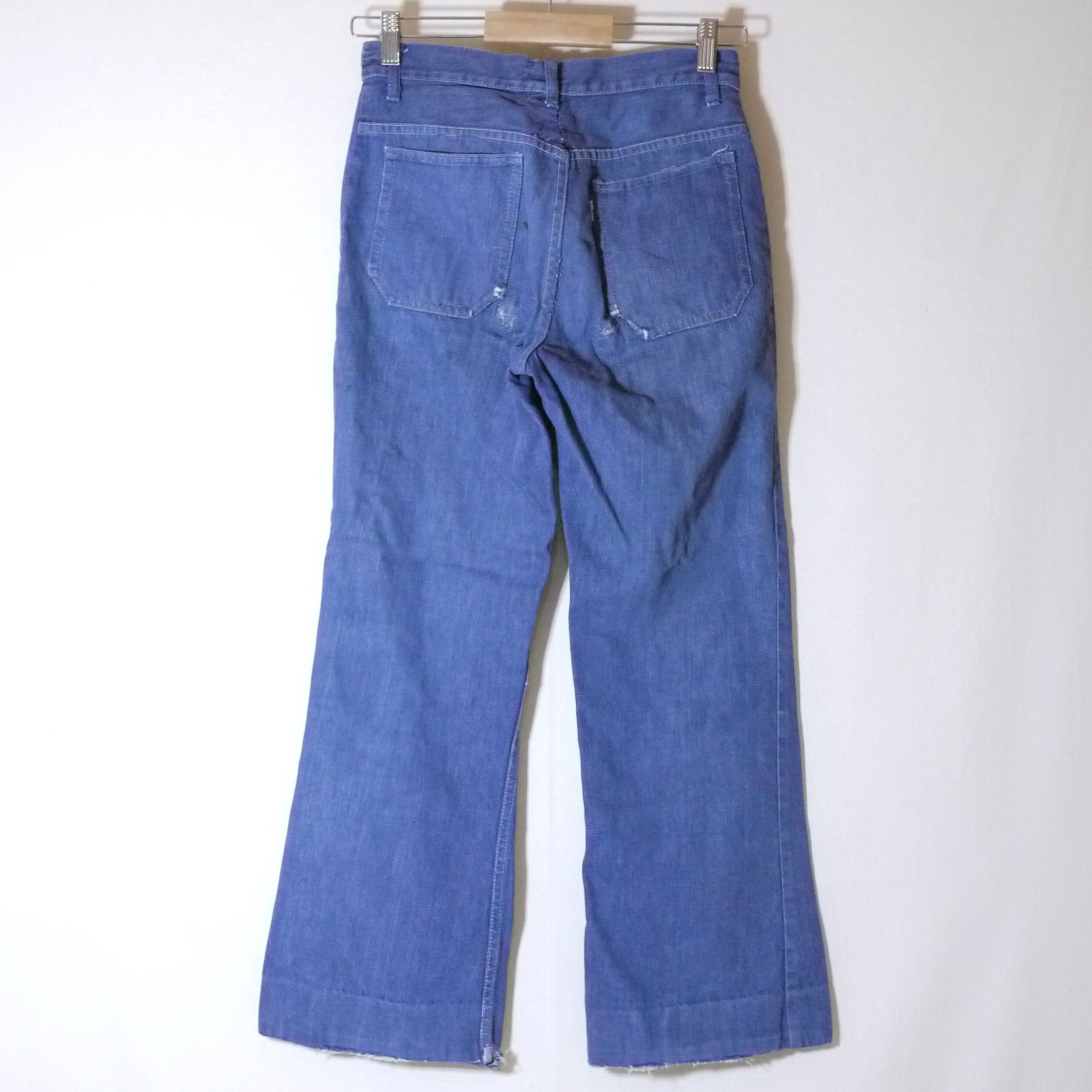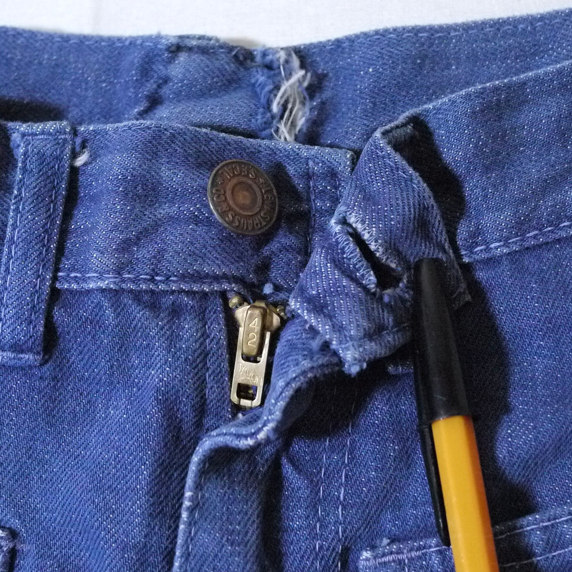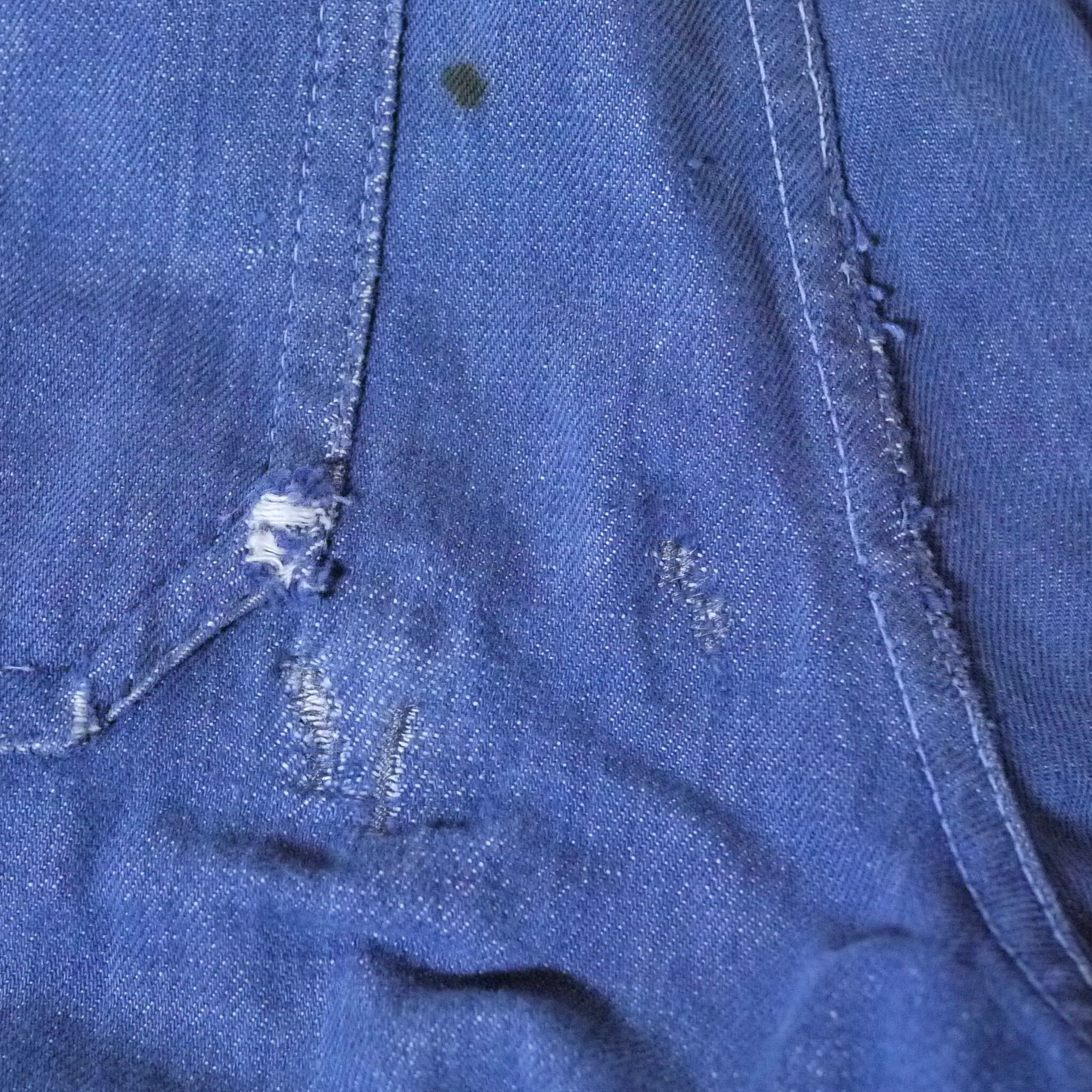 状態は、ジッパー横の生地がほつれているので開閉時に気を使います。ヒップと股にリペア。ウエストの腰部分に記事を摘んだリサイズがされています。ウエストの両脇に摘んだ後に解いた跡。所々に細かな汚れ。その他、スレなどの経年による使用感はありますが、着用に問題はありません。