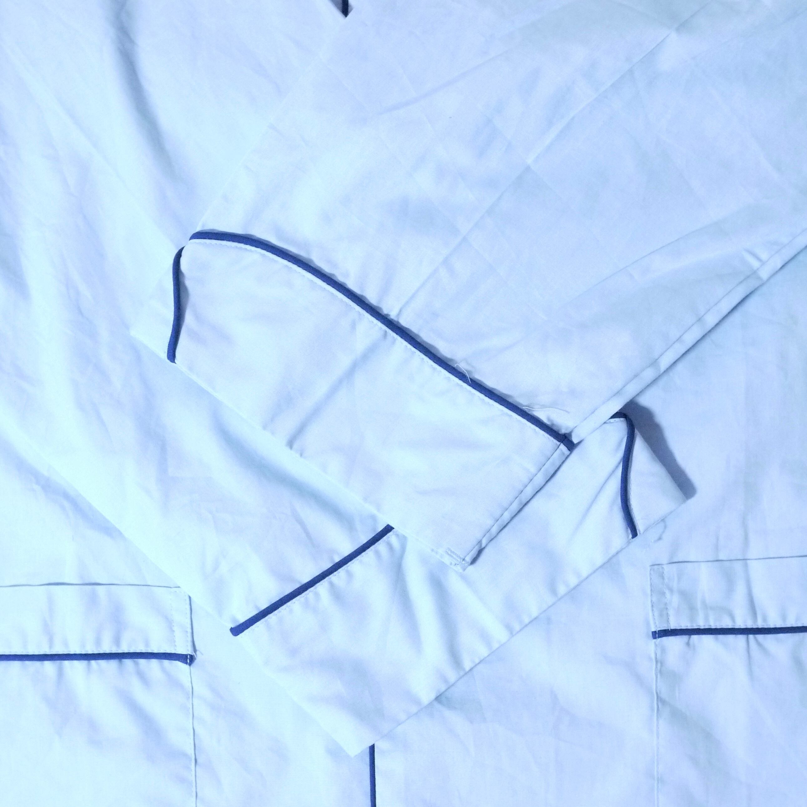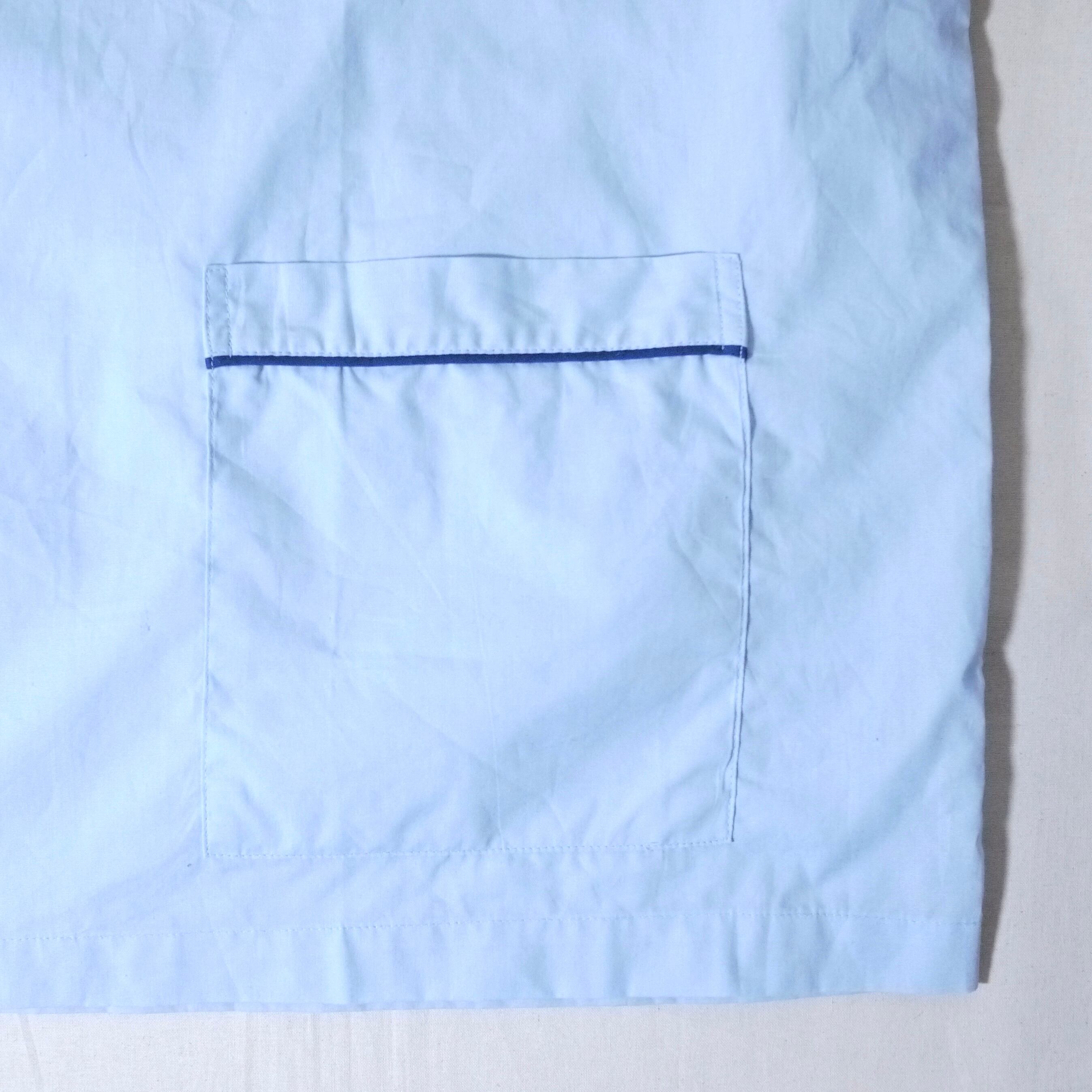 オープンカラーやパイピング、大きめのボタンなどパジャマシャツ特有のディテールがアクセントになっています。