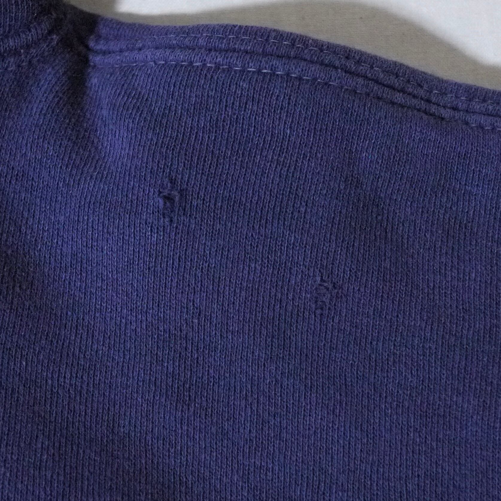 状態は、ネック部分にほつれ。左肩の後ろ側に汚れ。右肩にスレ。ポケットの上部、右袖、右肩の後ろ側に小穴。その他、経年による使用感はありますが、着用に問題はありません。