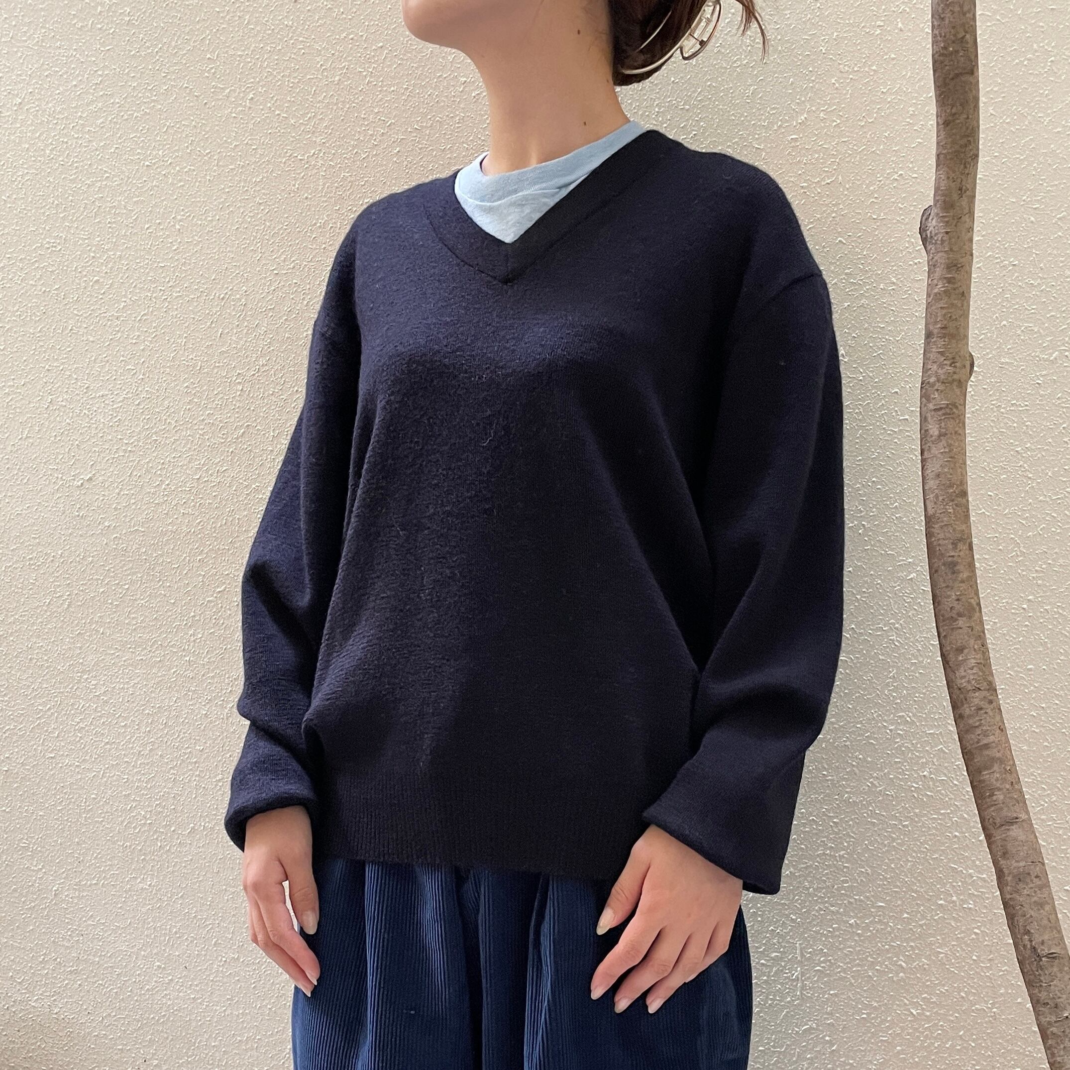シンプルなデザインで合わせやすく、深めのVネックなのでレイヤードを楽しめます。