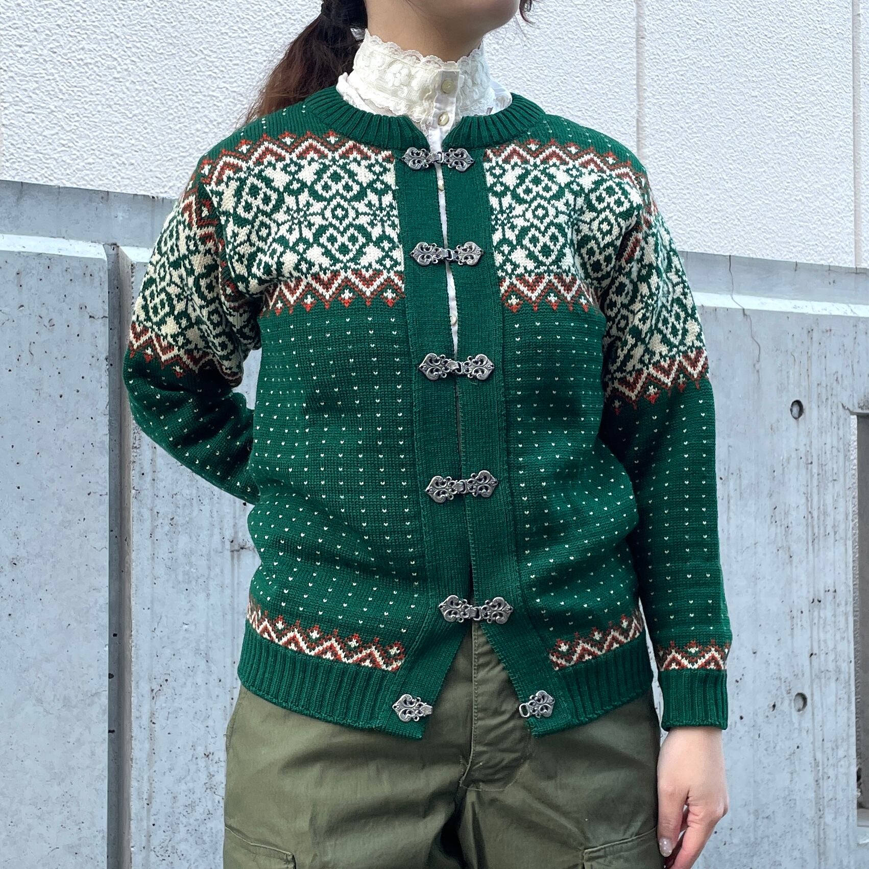 グリーンカラーをベースにキレイな配色のノルディックカーディガン。