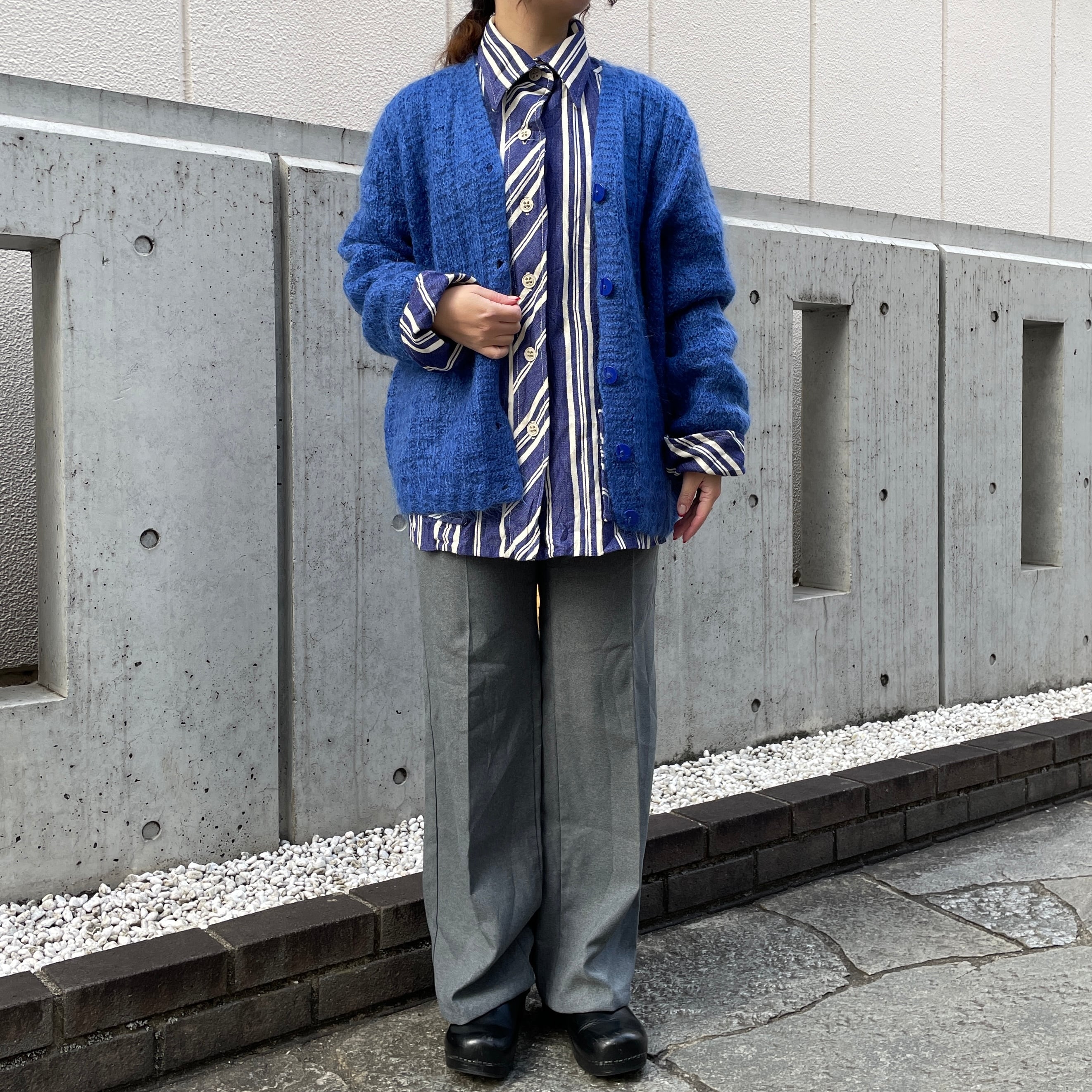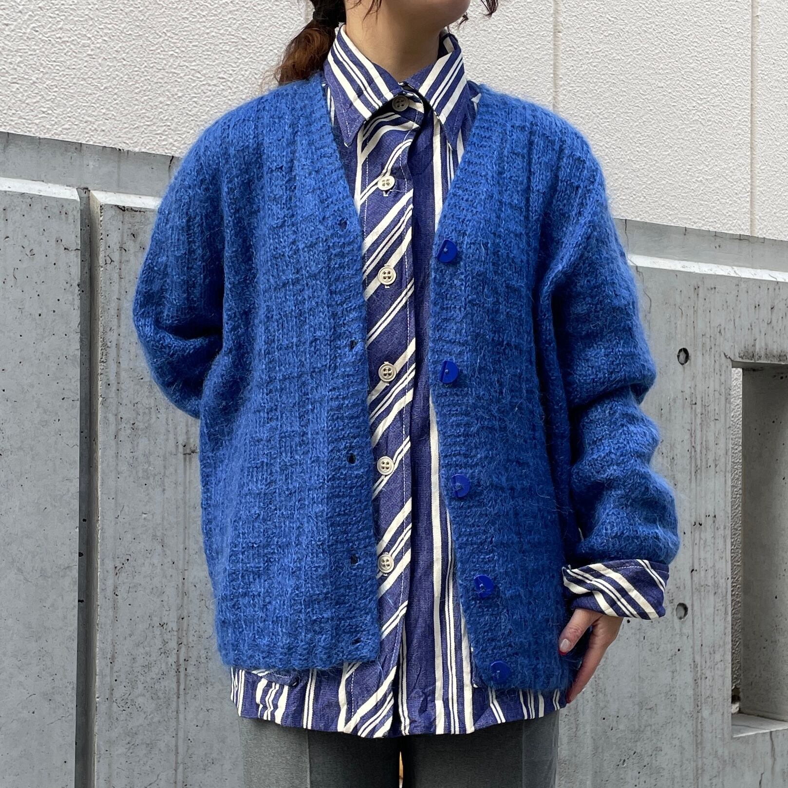 ブルーカラーのニットカーディガン。