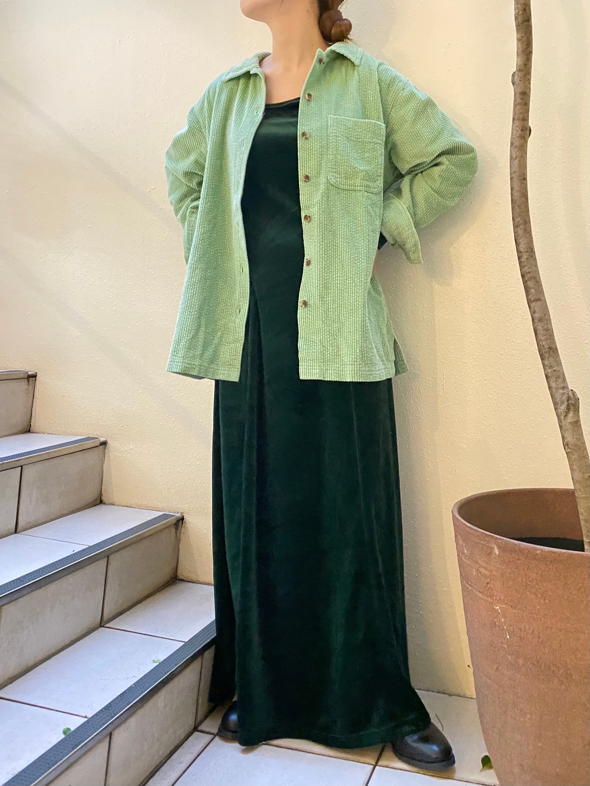 ライトグリーンカラーのコーデュロイシャツ。