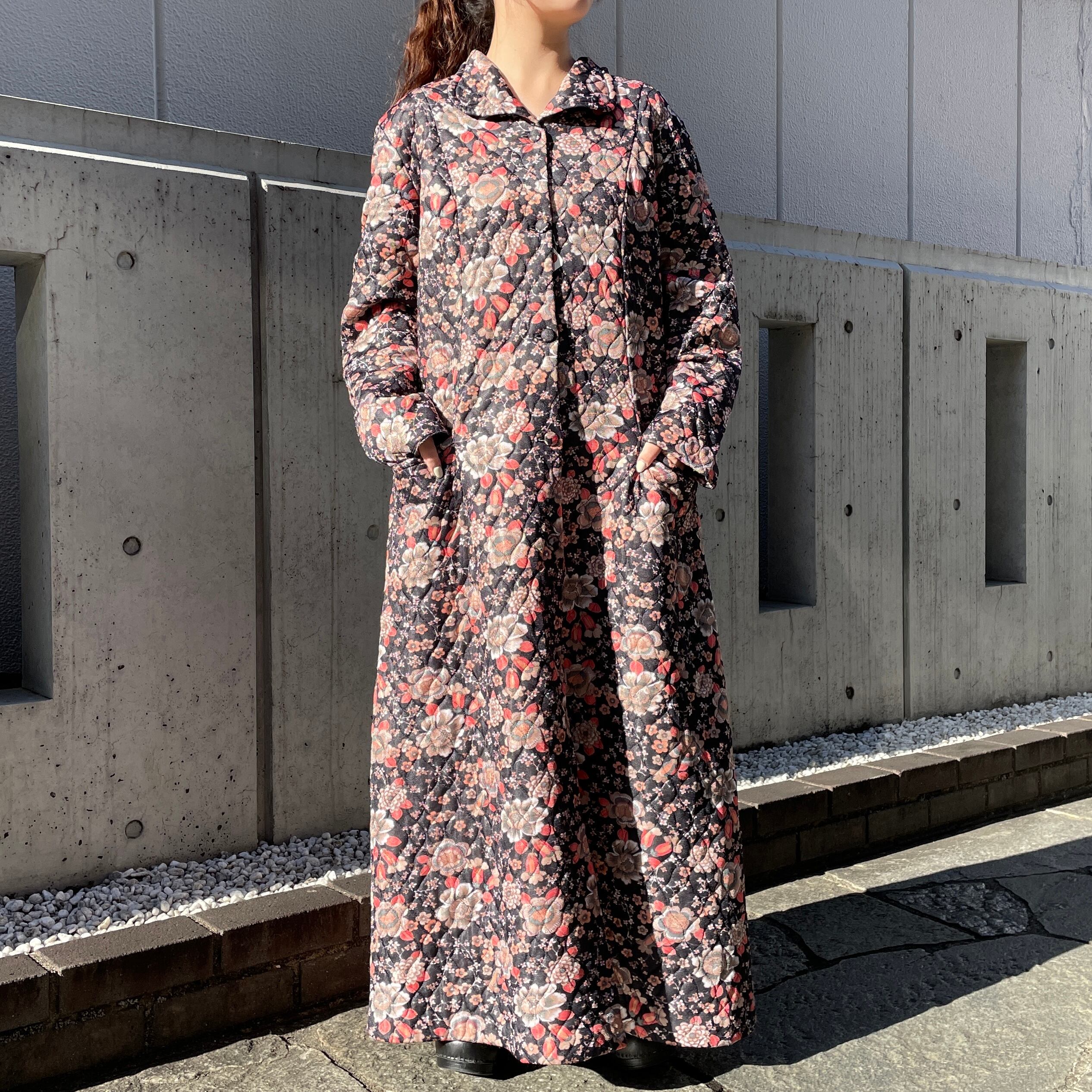 ブラックカラーがベースのキルティングコート。