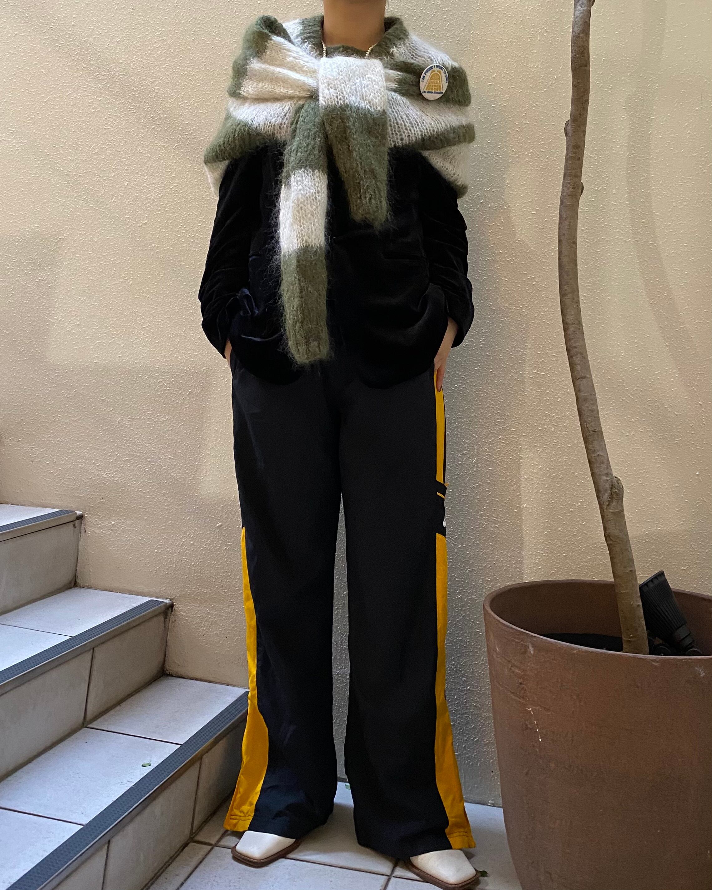 ブラックカラーのトラックパンツ。
