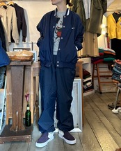 ネイビーカラーのトラックパンツ。