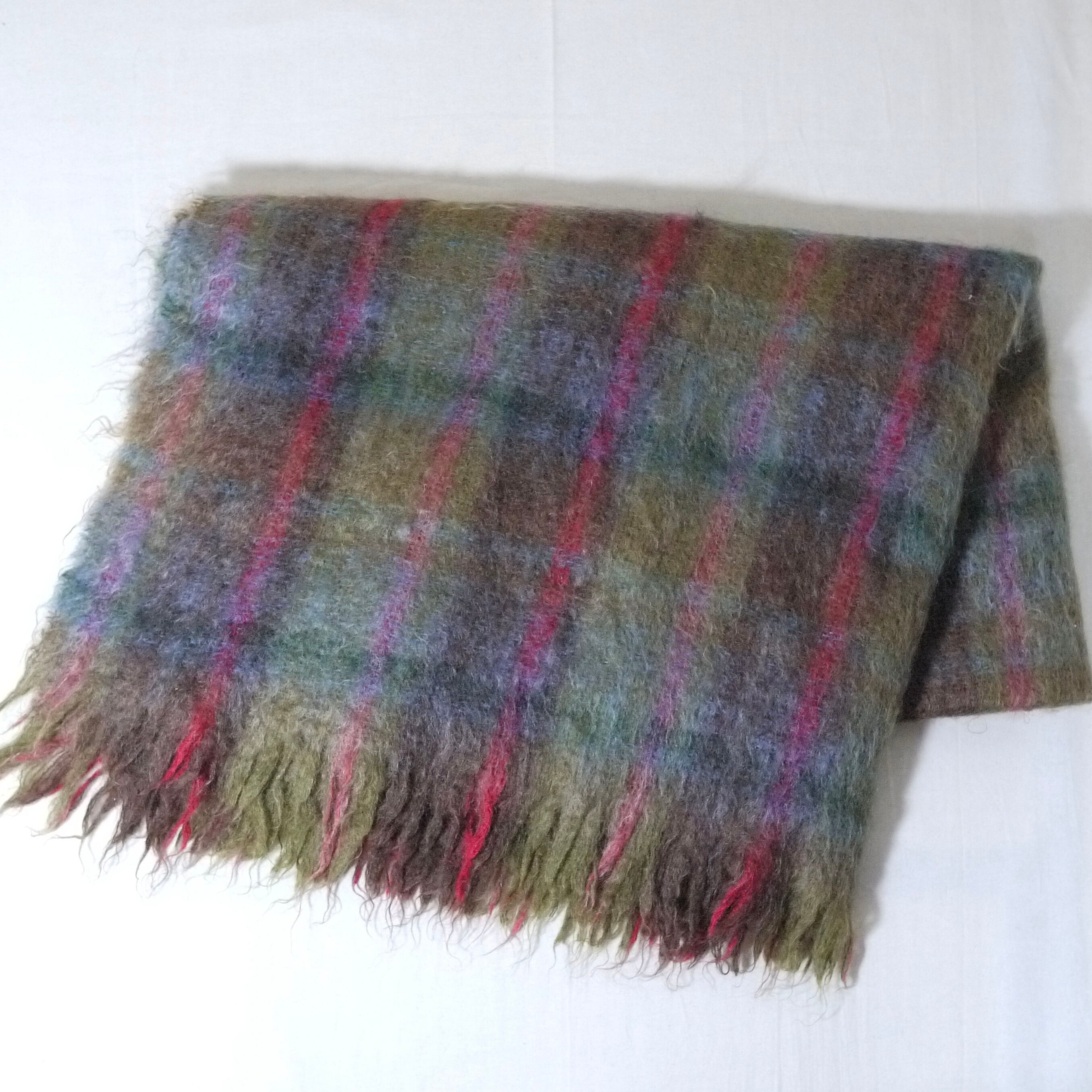 ブラウンやオリーブカラーがベースのチェック柄モヘアブランケット。