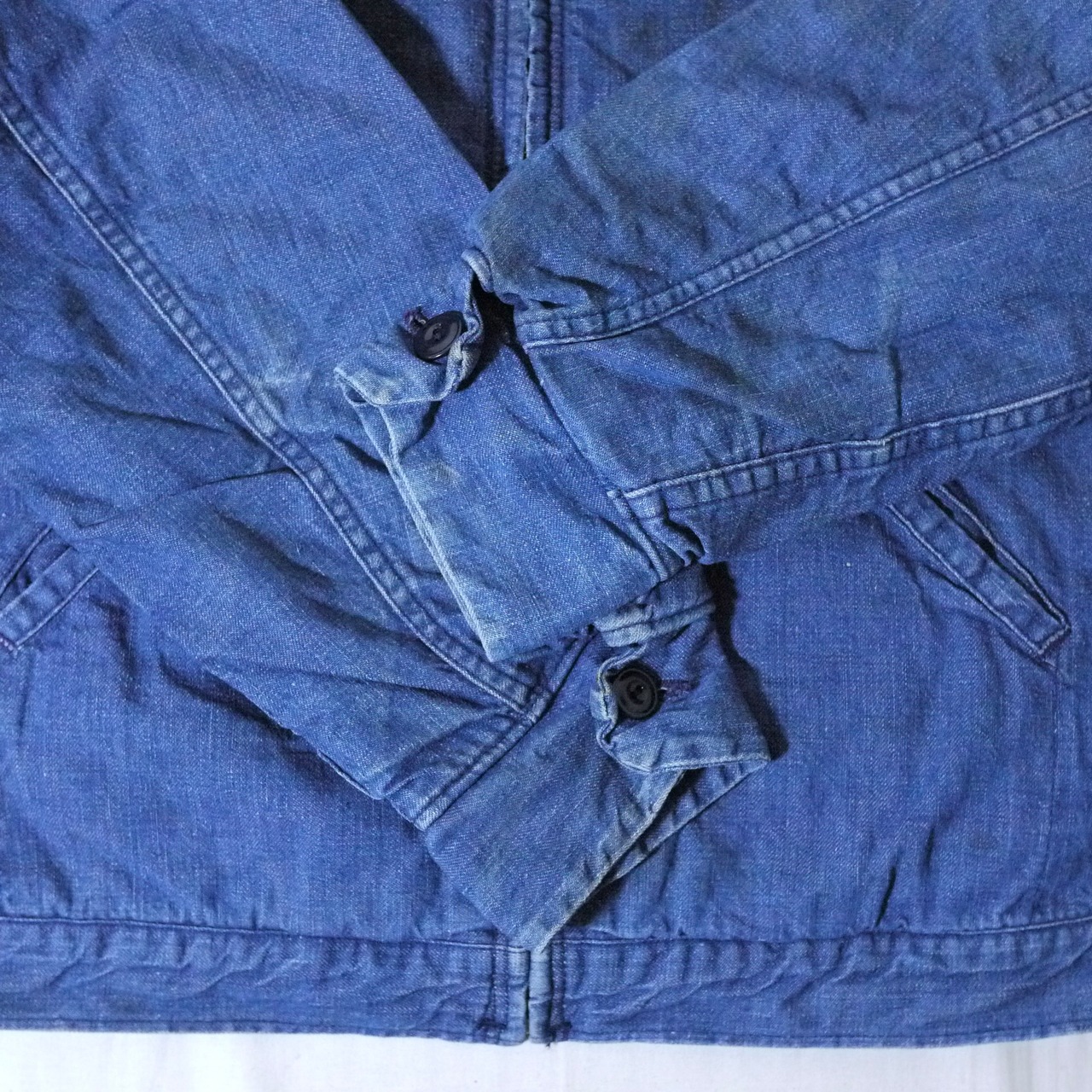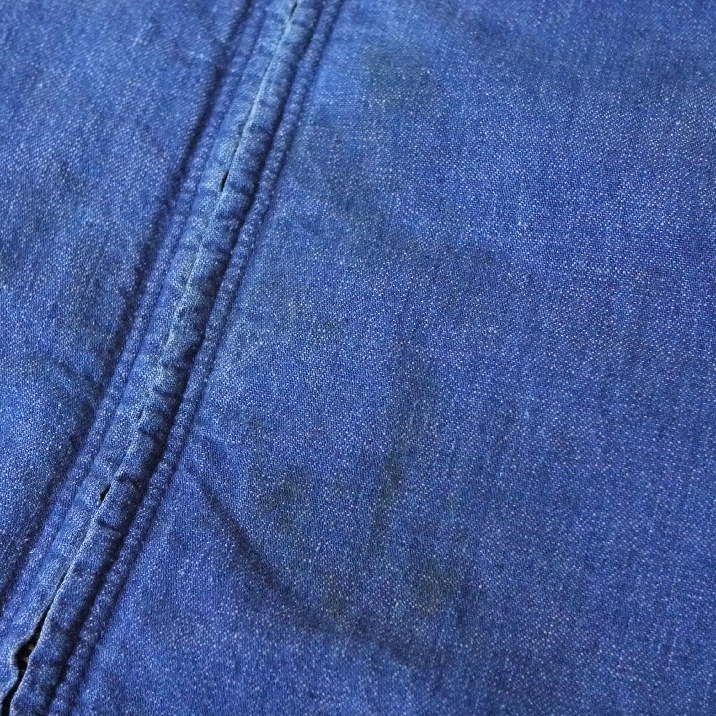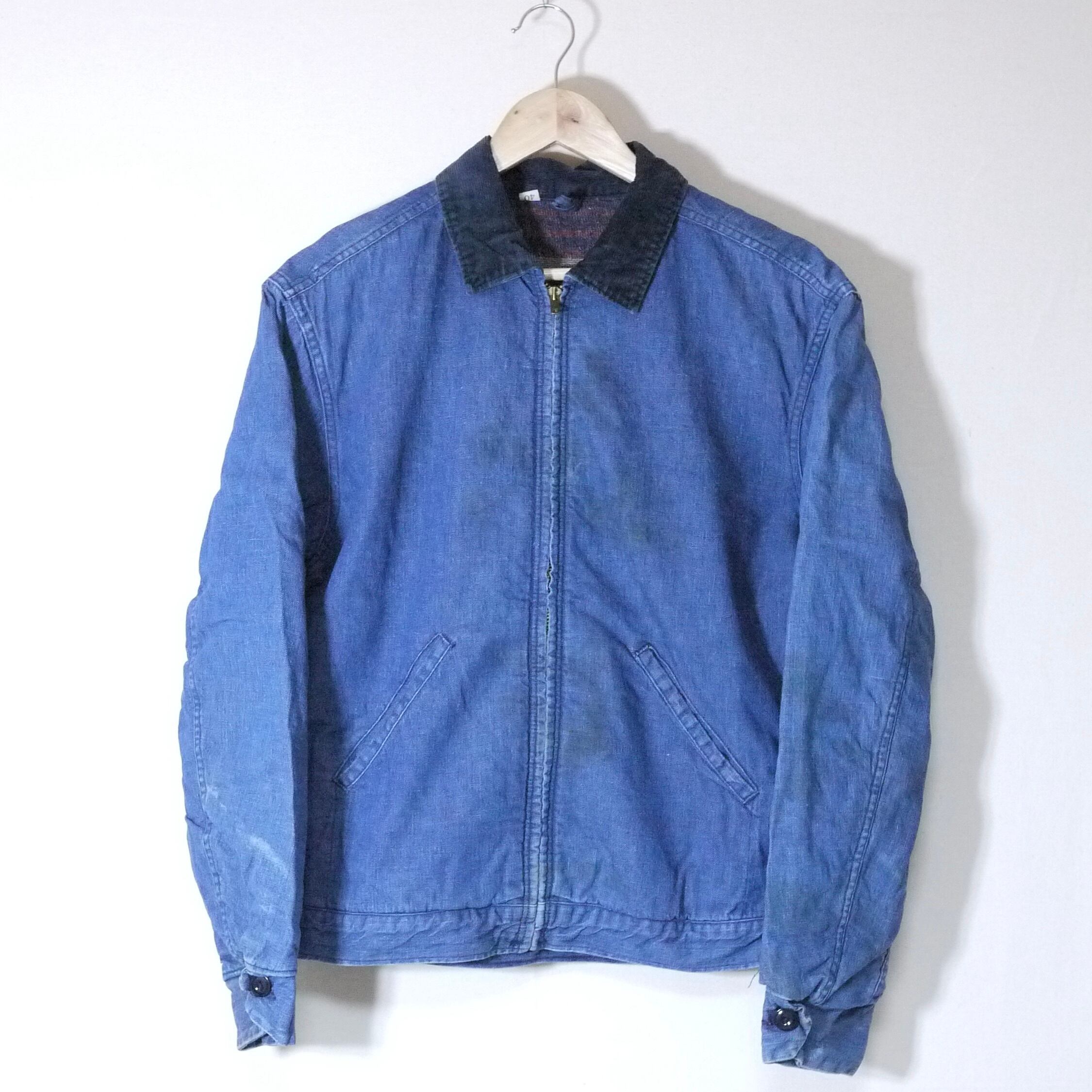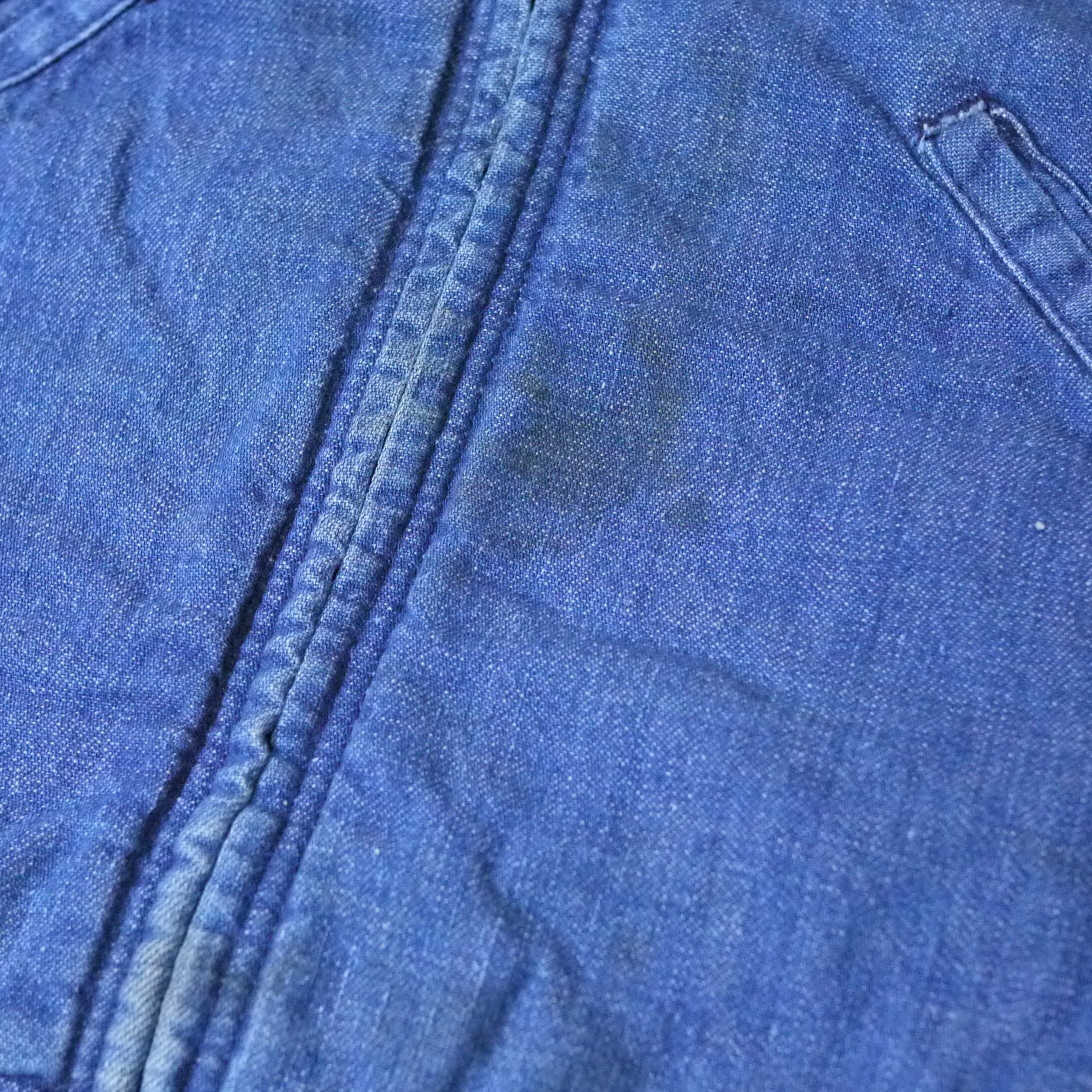 状態は、前身頃と左袖に汚れ。右袖にスレ。後ろ身頃の右脇付近に小さなダメージ。その他、スレなどの経年による使用感が多少はありますが、着用に問題ありません。この年代のワークウェアとしてはコンディションは良いアイテムではありますが、ご理解のある方にお願いします。