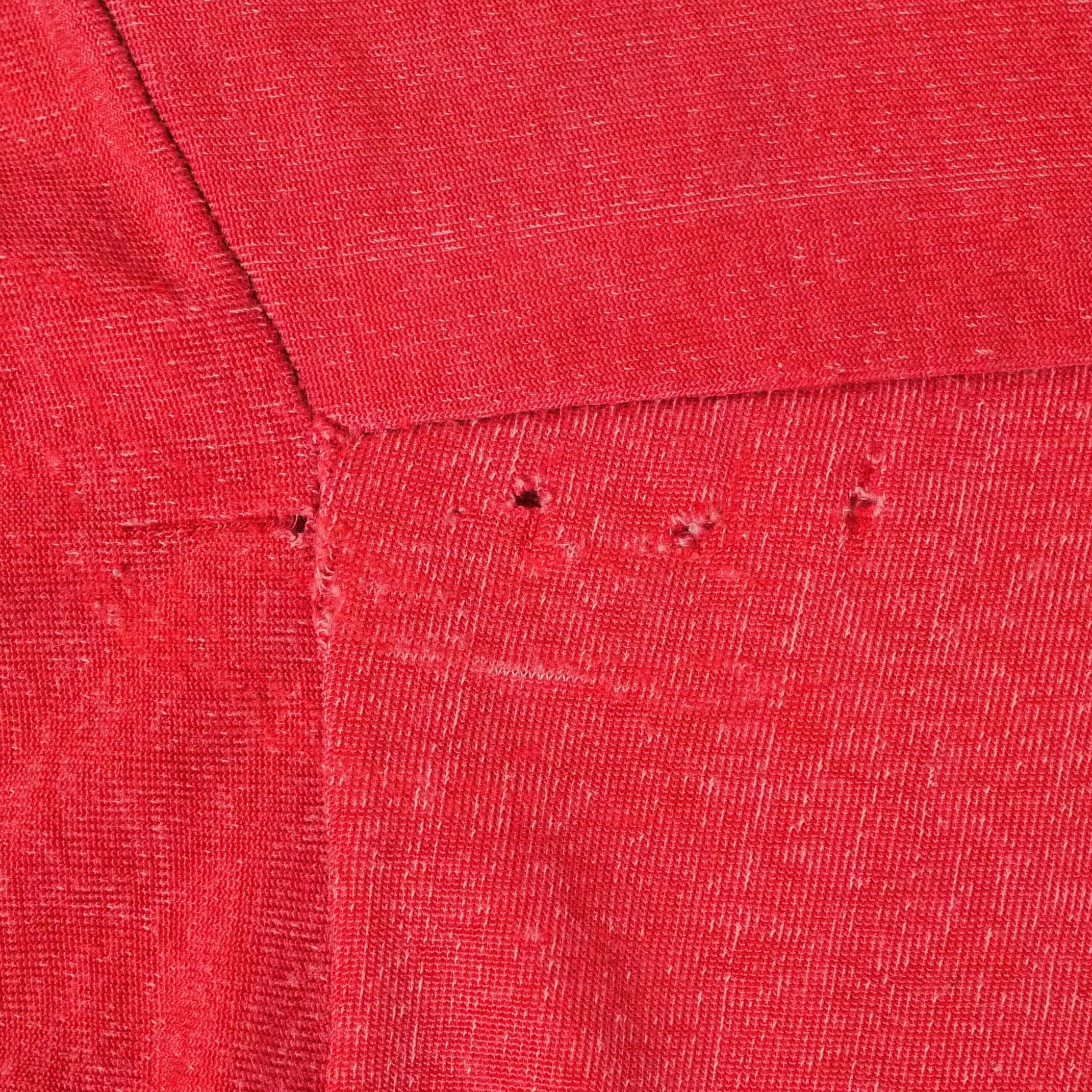 状態は、裾がカットオフされ、簡単な縫製がされていますがほつれてきています。左袖に汚れ。ヨーク部分を中心に所々に小穴。その他、経年による使用感がありますが、着用に問題はありません。コンディションをご理解頂ける方にお願いします。
