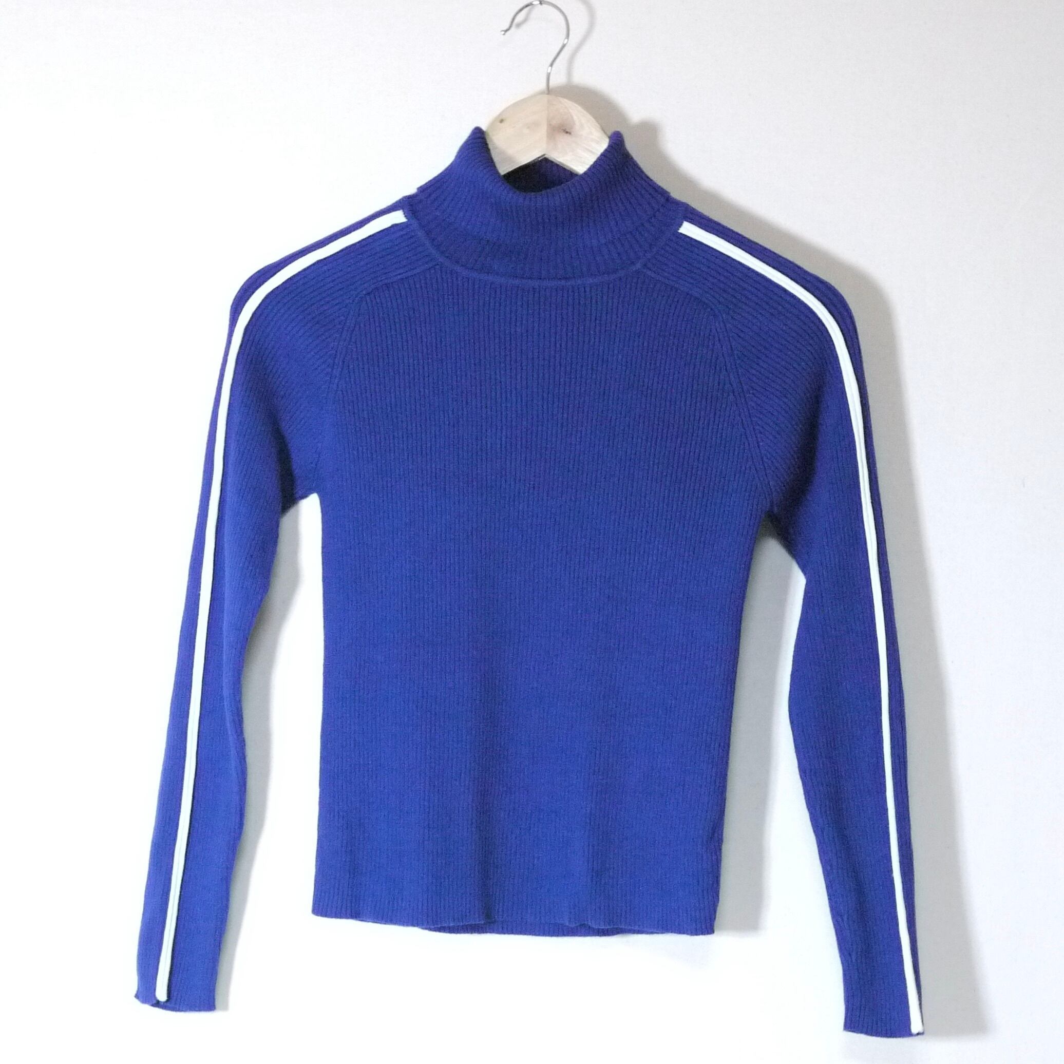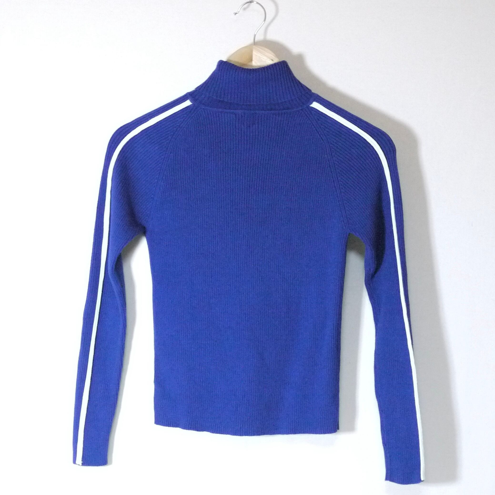 ブルーカラーのタートルネックリブニット。