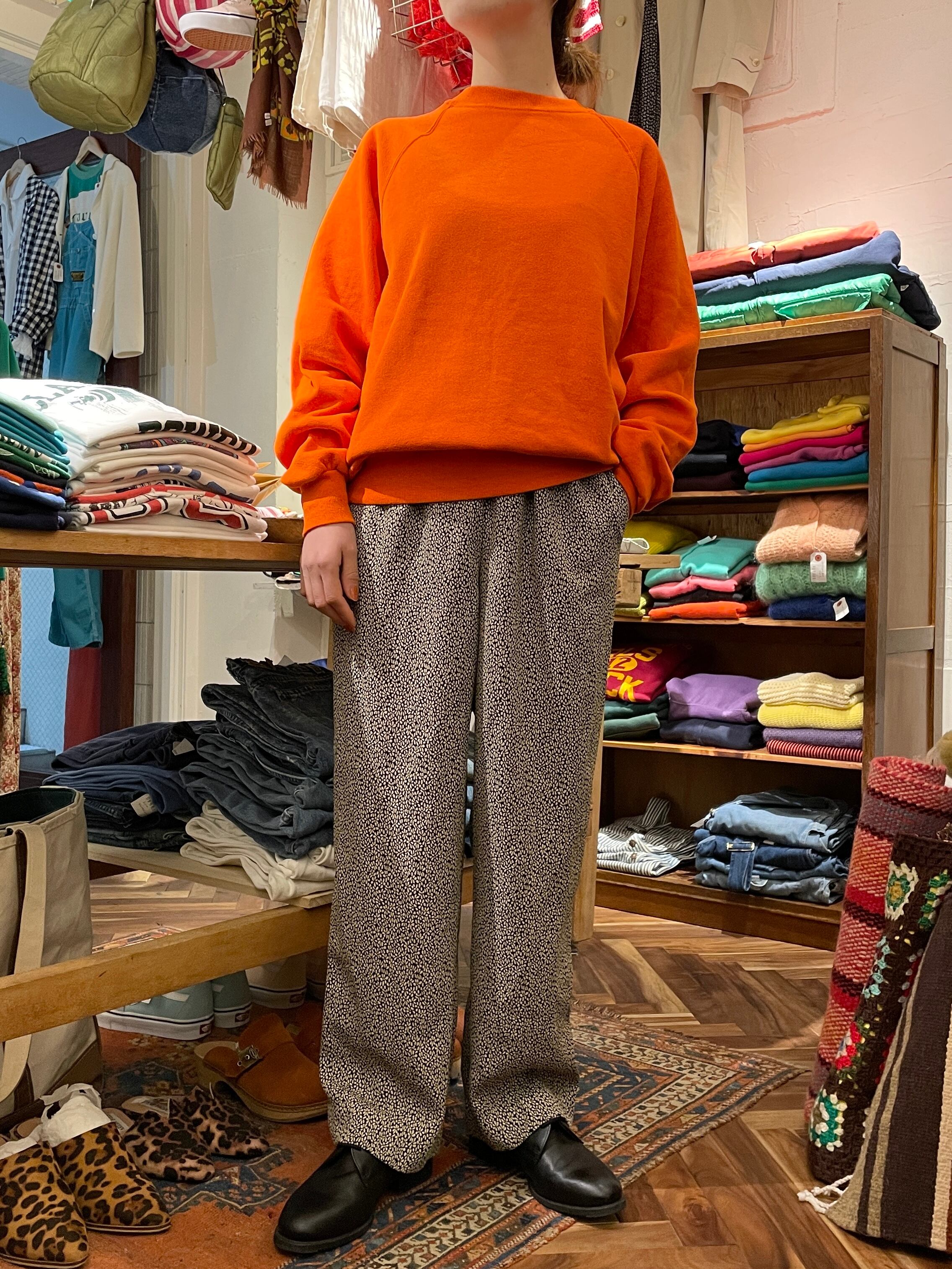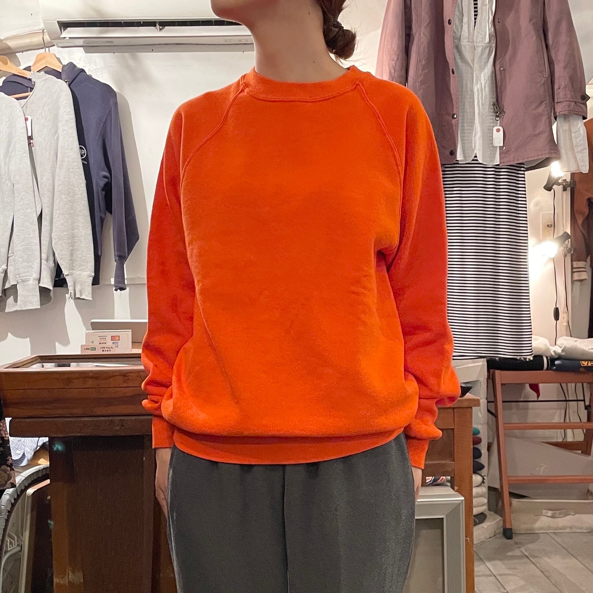 オレンジカラーのスウェット。