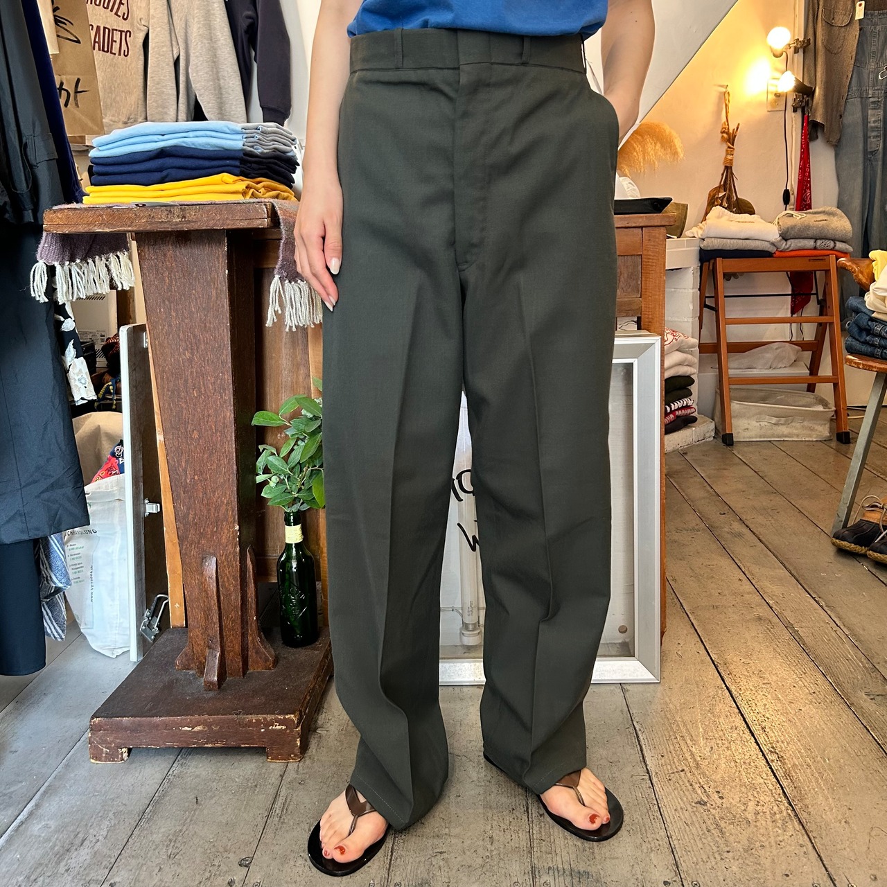 落ち着いたグリーン系カラーのウールパンツ。