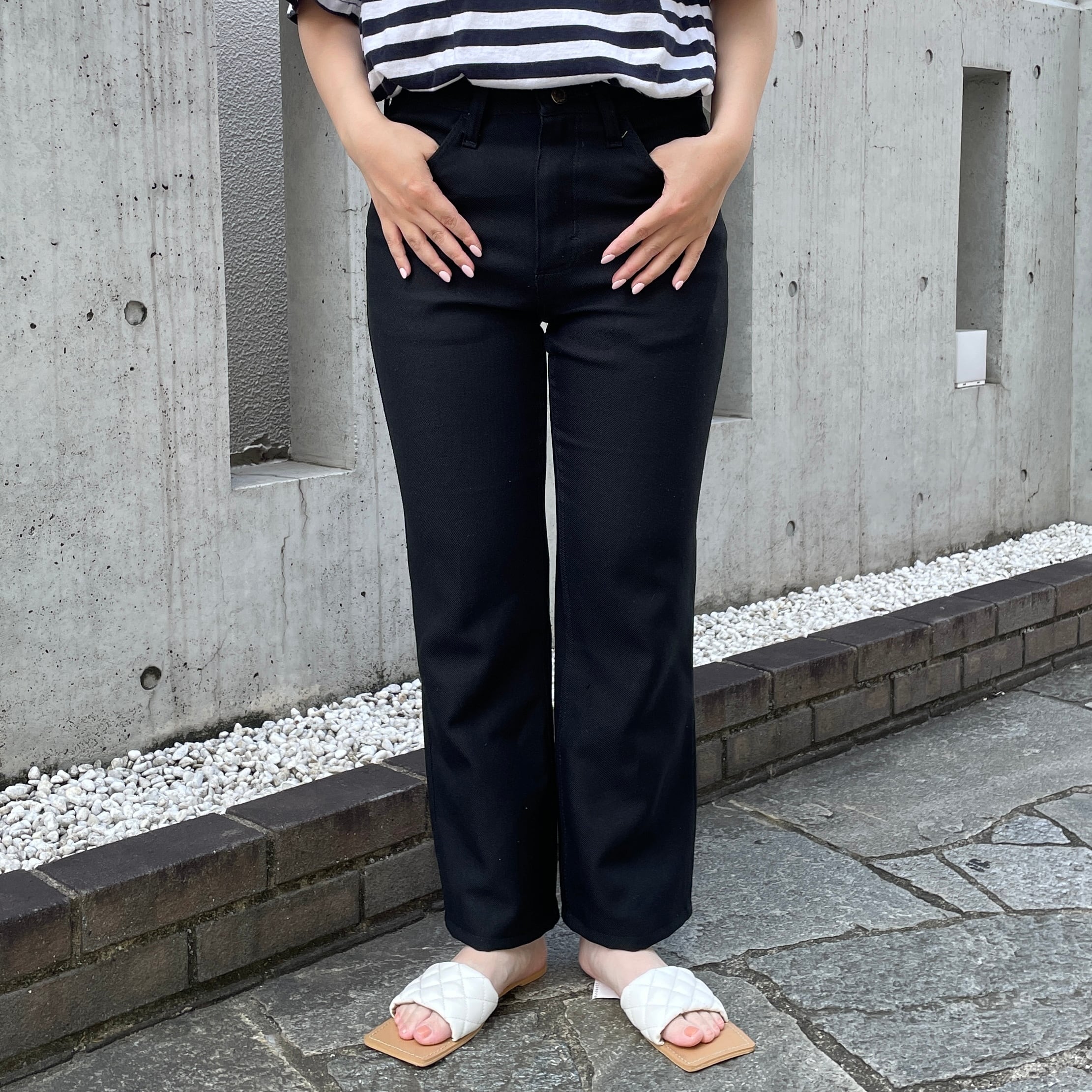 細身のキレイなシルエットのスラックスパンツ。
